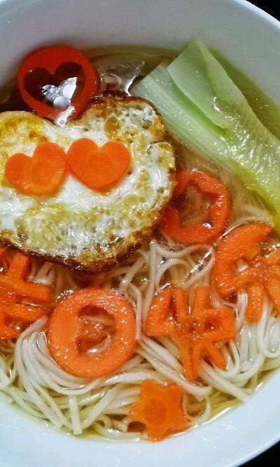Noodle Soup with Egg | ["noodles","egg","carrots","lettuce"] | ["noodles:200g","egg:50g","carrots:50g","lettuce:100g"] | |