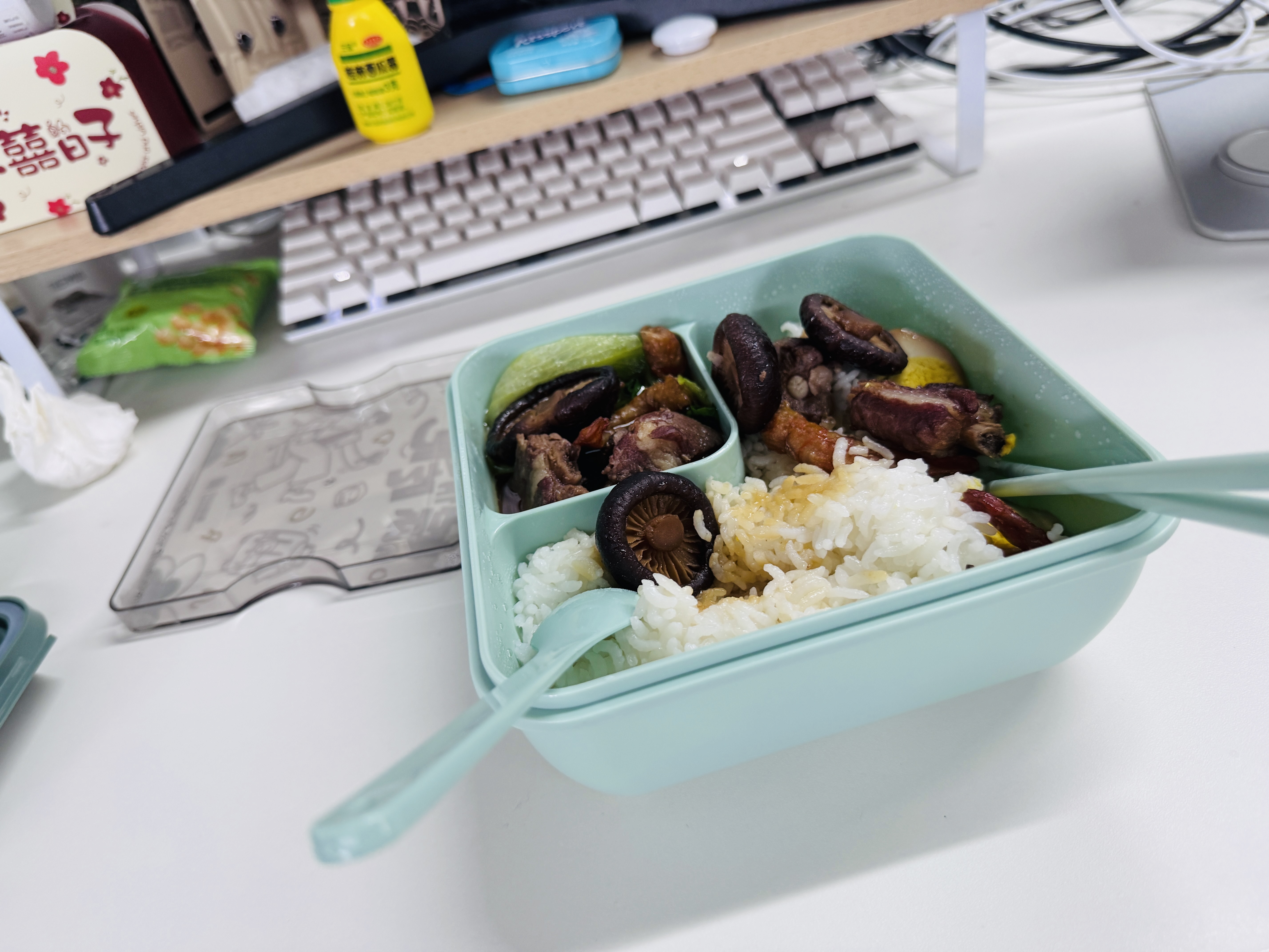 Mixed Rice Bowl | ["rice","chicken","mushrooms","vegetables"] | ["rice:250g","meat:150g","vegetables:100g"] | |