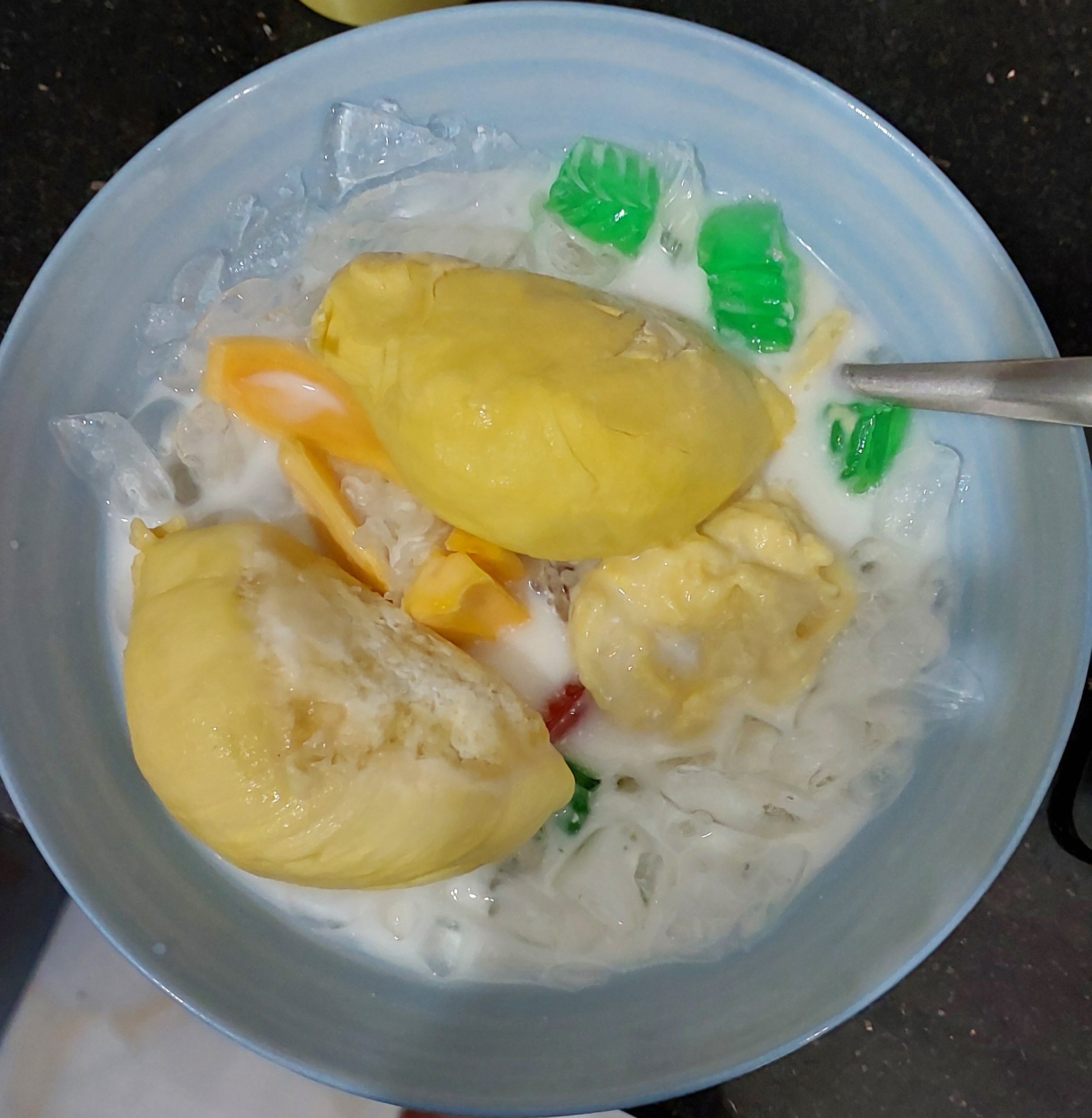 Durian Dessert | ["durian","coconut milk","jelly","ice"] | ["durian:200g","coconut milk:100g","jelly:50g"] | |