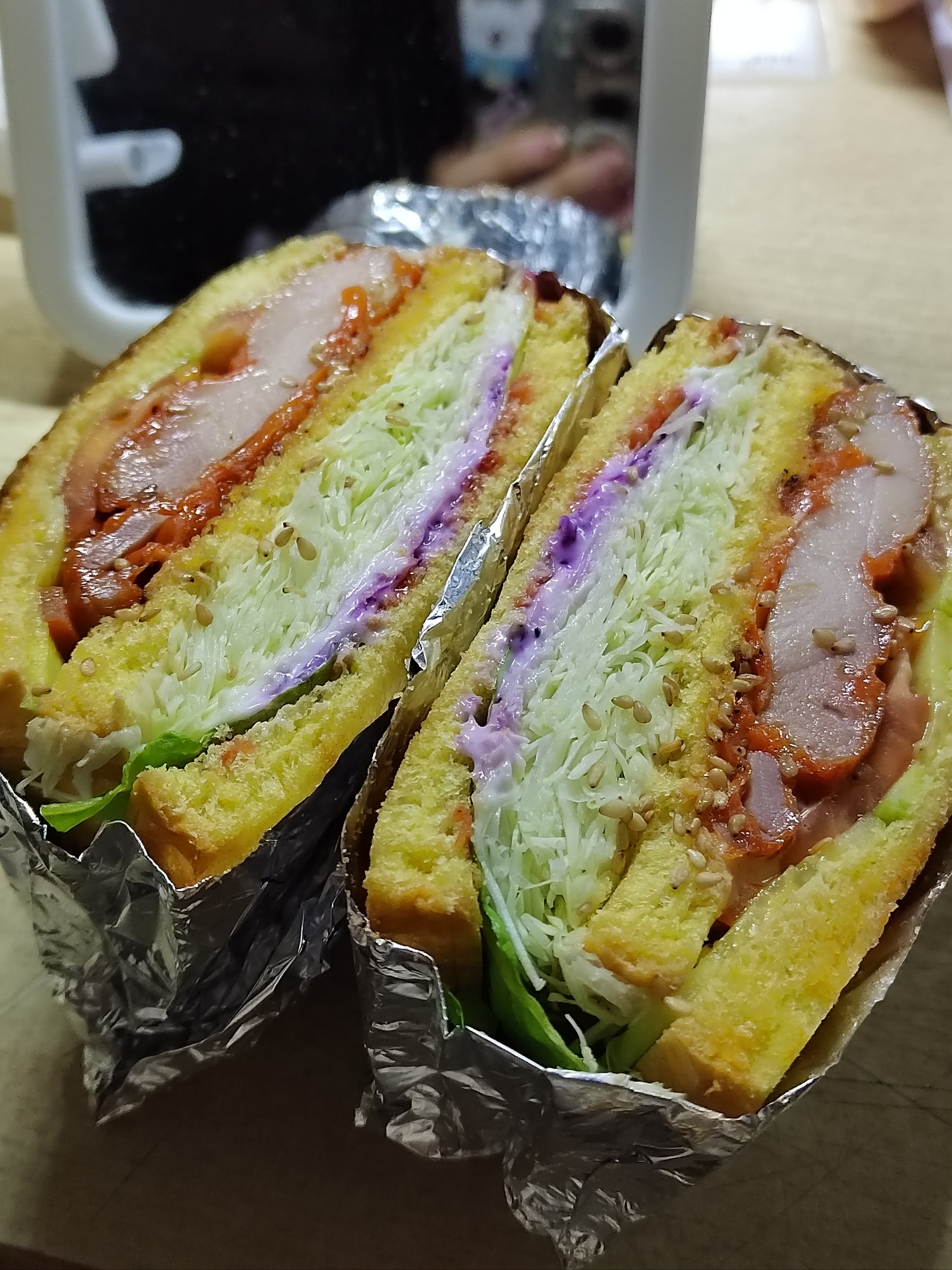 Sandwich | ["bread","chicken","cabbage","sauce"] | ["bread:200g","meat:100g","vegetables:50g"] | |