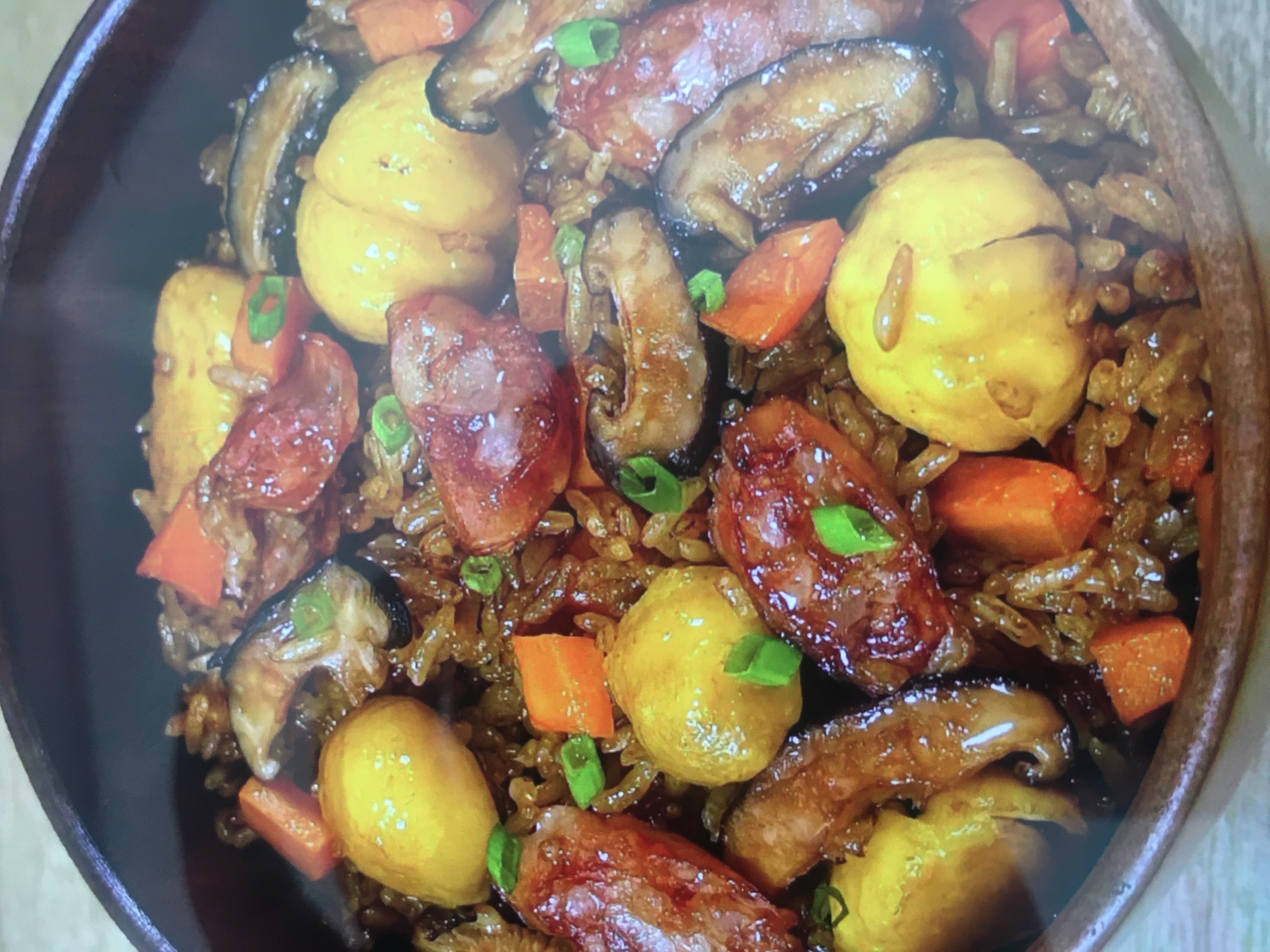 Fried Rice | ["rice","chicken","carrots","mushrooms","chestnuts","green onions"] | ["rice:300g","chicken:100g","vegetables:50g"] | |