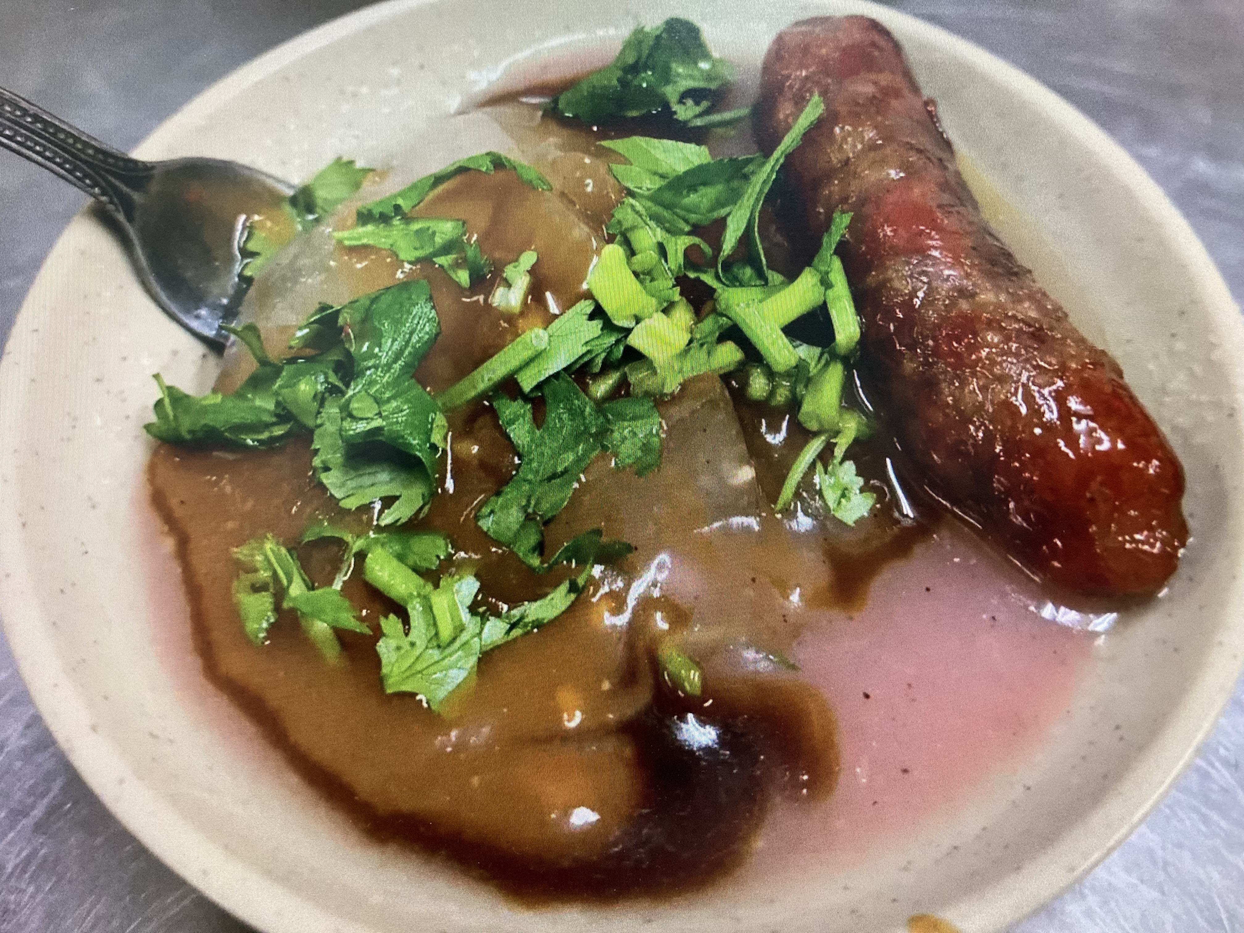 Sausage with sauce and garnish | ["sausage","sauce","cilantro","green onions"] | ["sausage:150g","sauce:200g","garnish:20g"] | |
