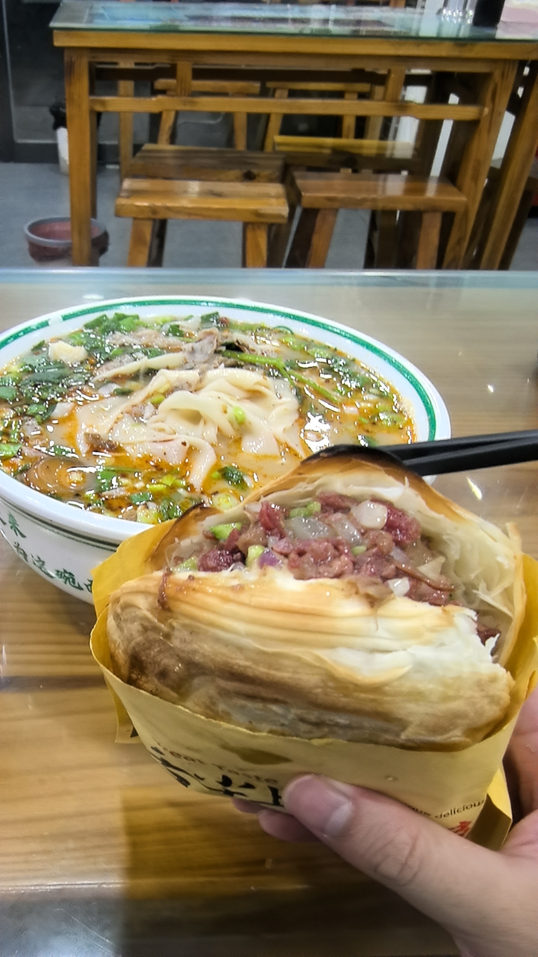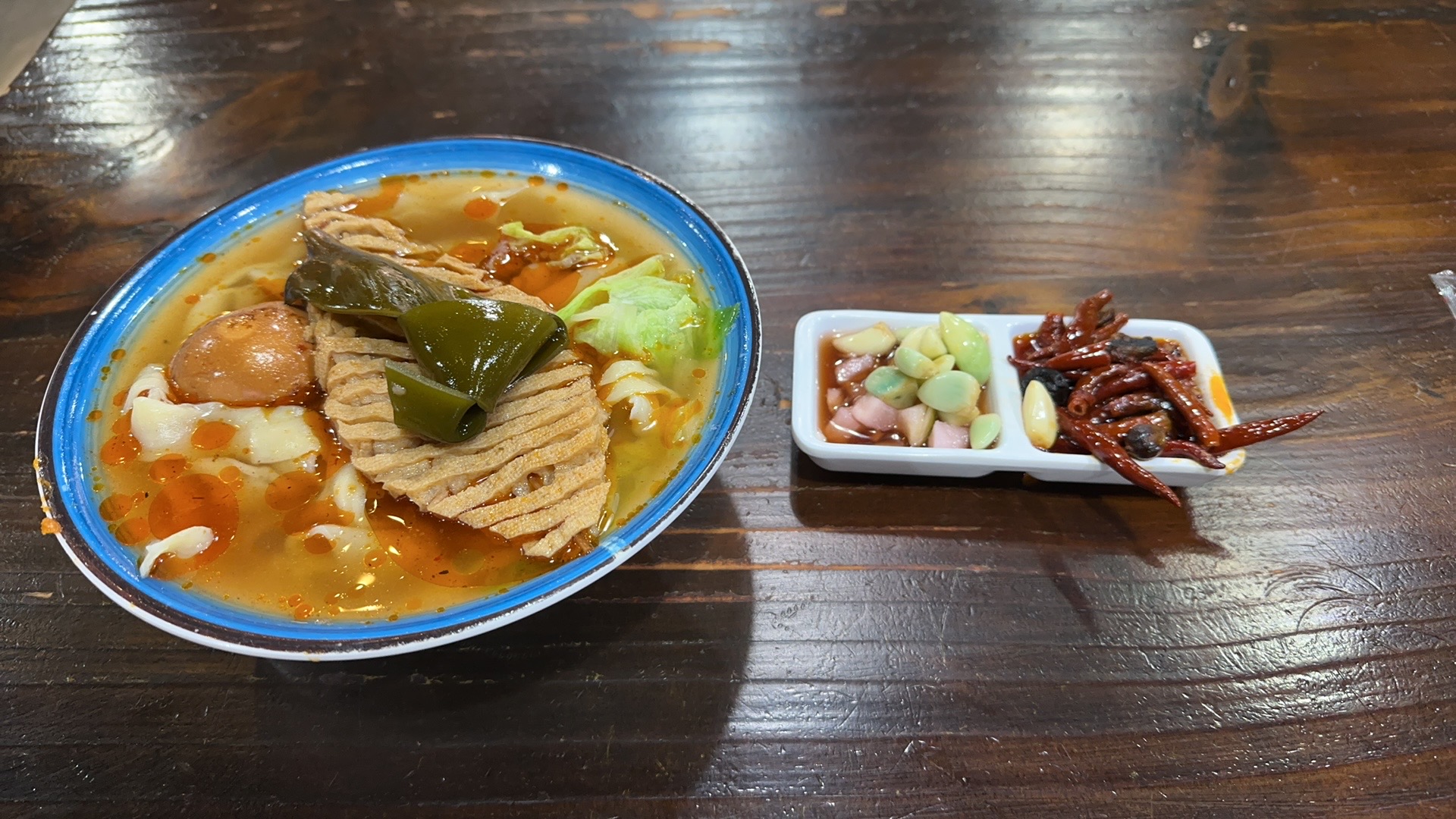 Noodle Soup and Meat Pastry | ["noodles","meat","vegetables","pastry dough"] | ["noodles:300g","meat pastry:150g"] | |