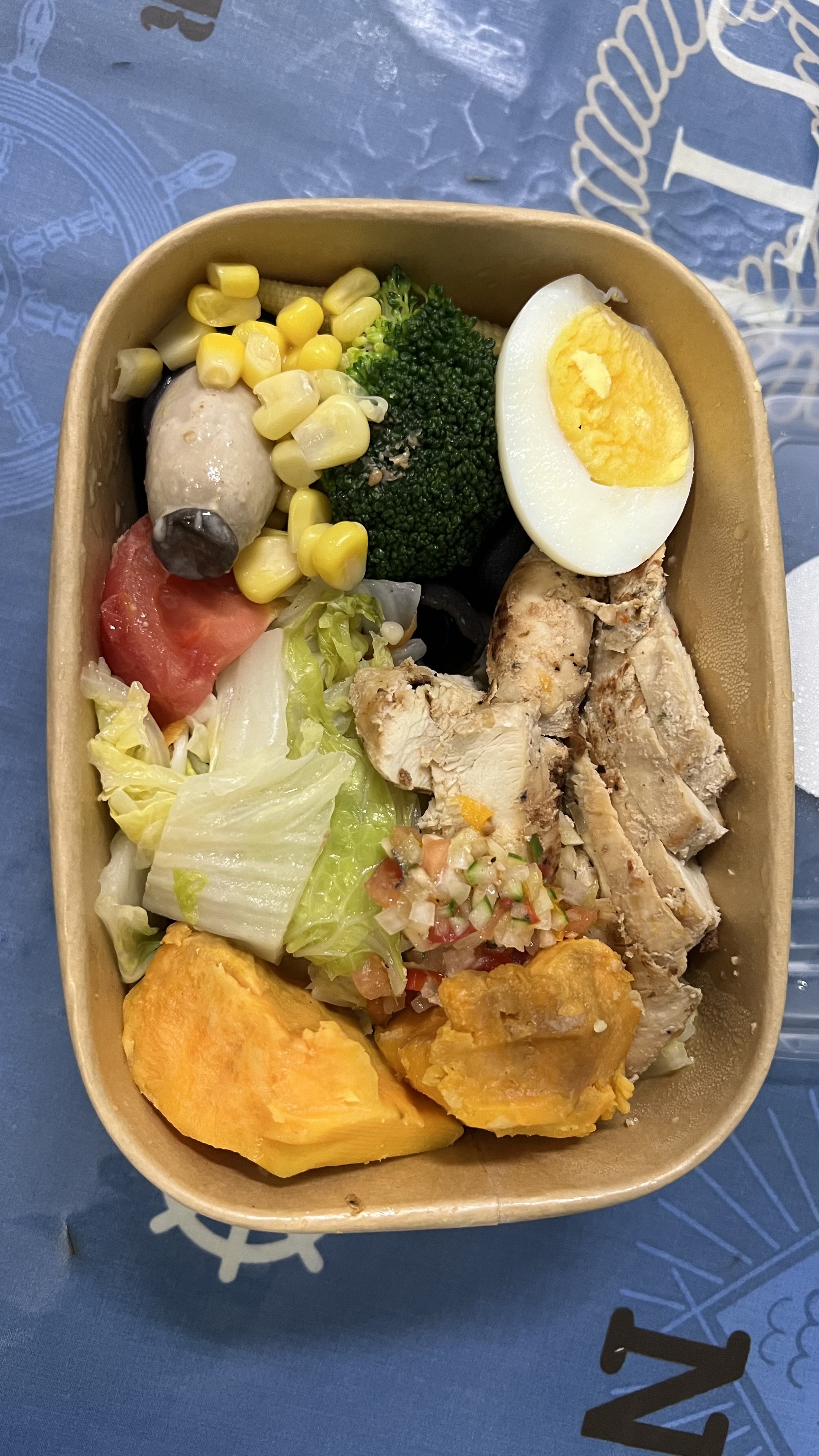 Mixed Vegetable and Chicken Bowl | ["chicken","sweet potato","broccoli","corn","egg","tomato","lettuce"] | ["chicken:200g","sweet potato:150g","broccoli:100g","corn:50g","egg:50g","tomato:50g","lettuce:50g"] | |