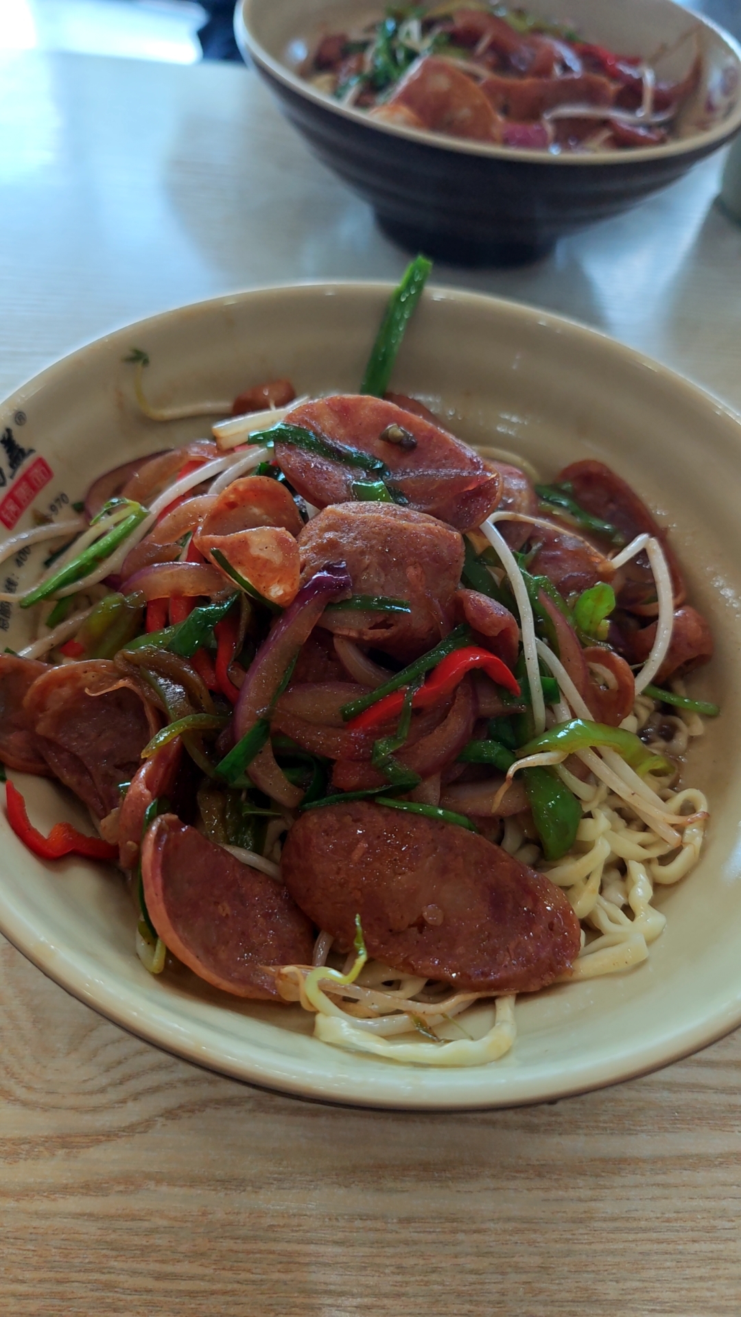 Stir-fried noodles with sausage | ["noodles","sausage","bell peppers","onions","bean sprouts"] | ["noodles:200g","sausage:100g","vegetables:50g"] | |