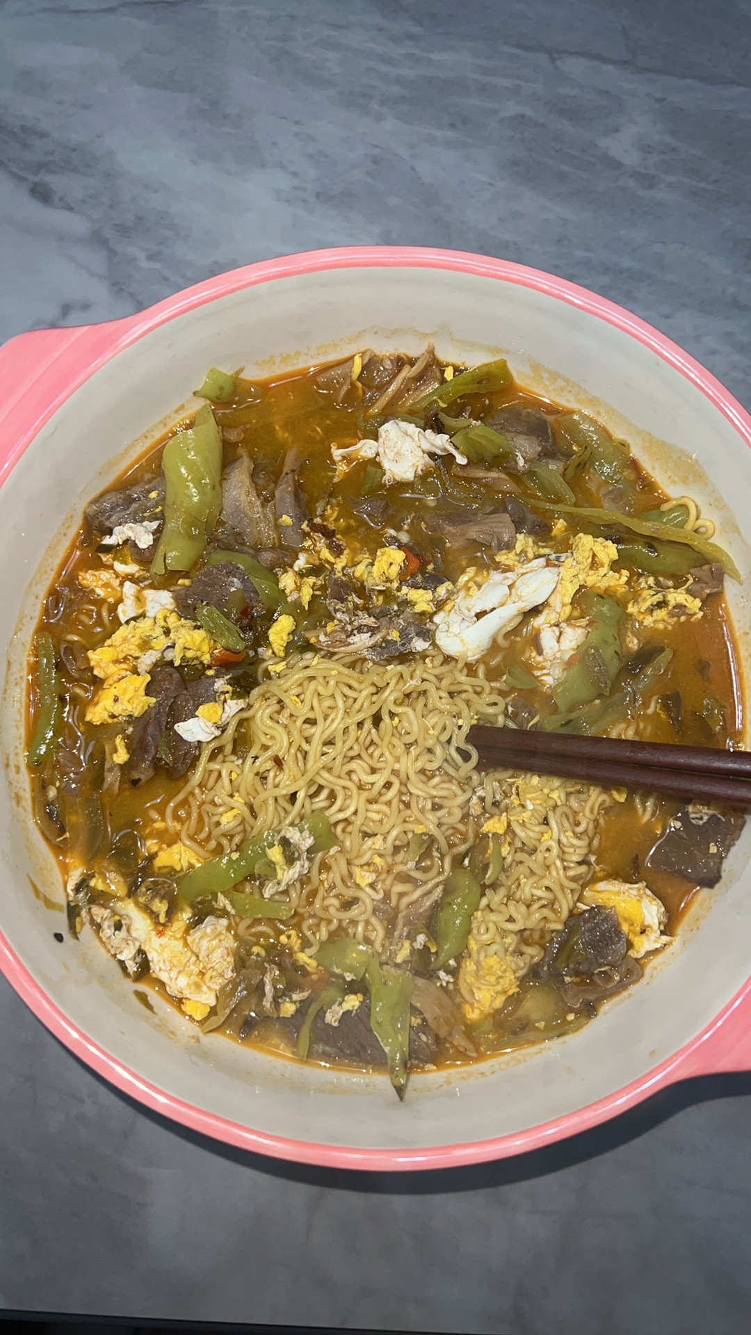 Noodle Stir Fry | ["noodles","beef","green peppers","egg","spices"] | ["noodles:200g","beef:100g","vegetables:150g","egg:50g"] | |