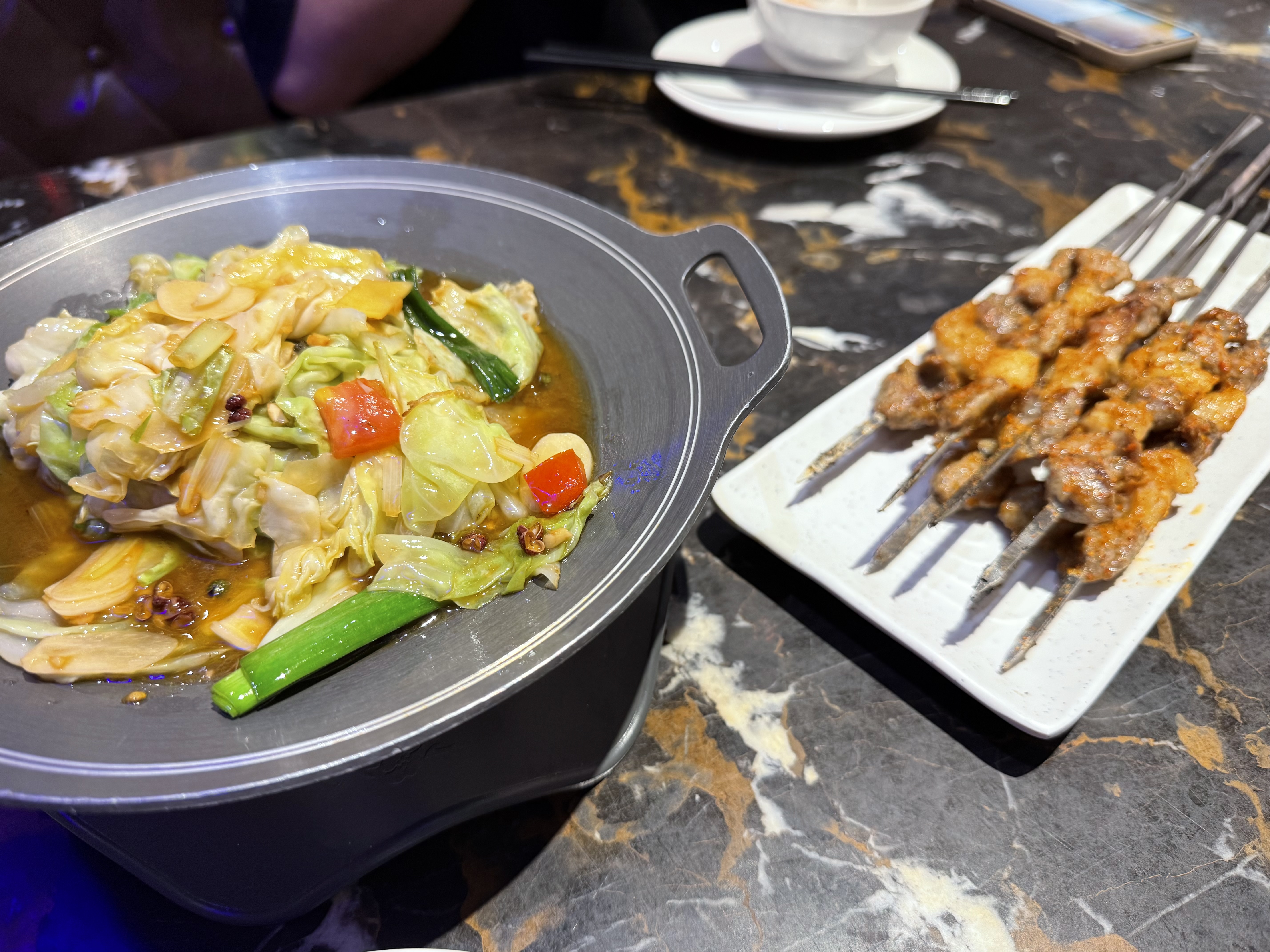 Stir-fried vegetables and skewered meat | ["cabbage","bell pepper","green onion","meat","spices"] | ["vegetables:300g","skewered meat:200g"] | |