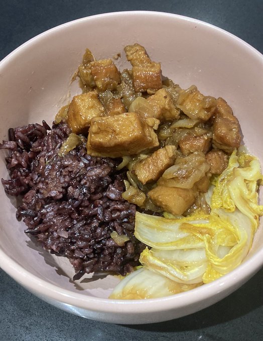 Tofu and Rice Bowl | ["tofu","black rice","cabbage","onions"] | ["tofu:200g","black rice:150g","cabbage:50g"] | |