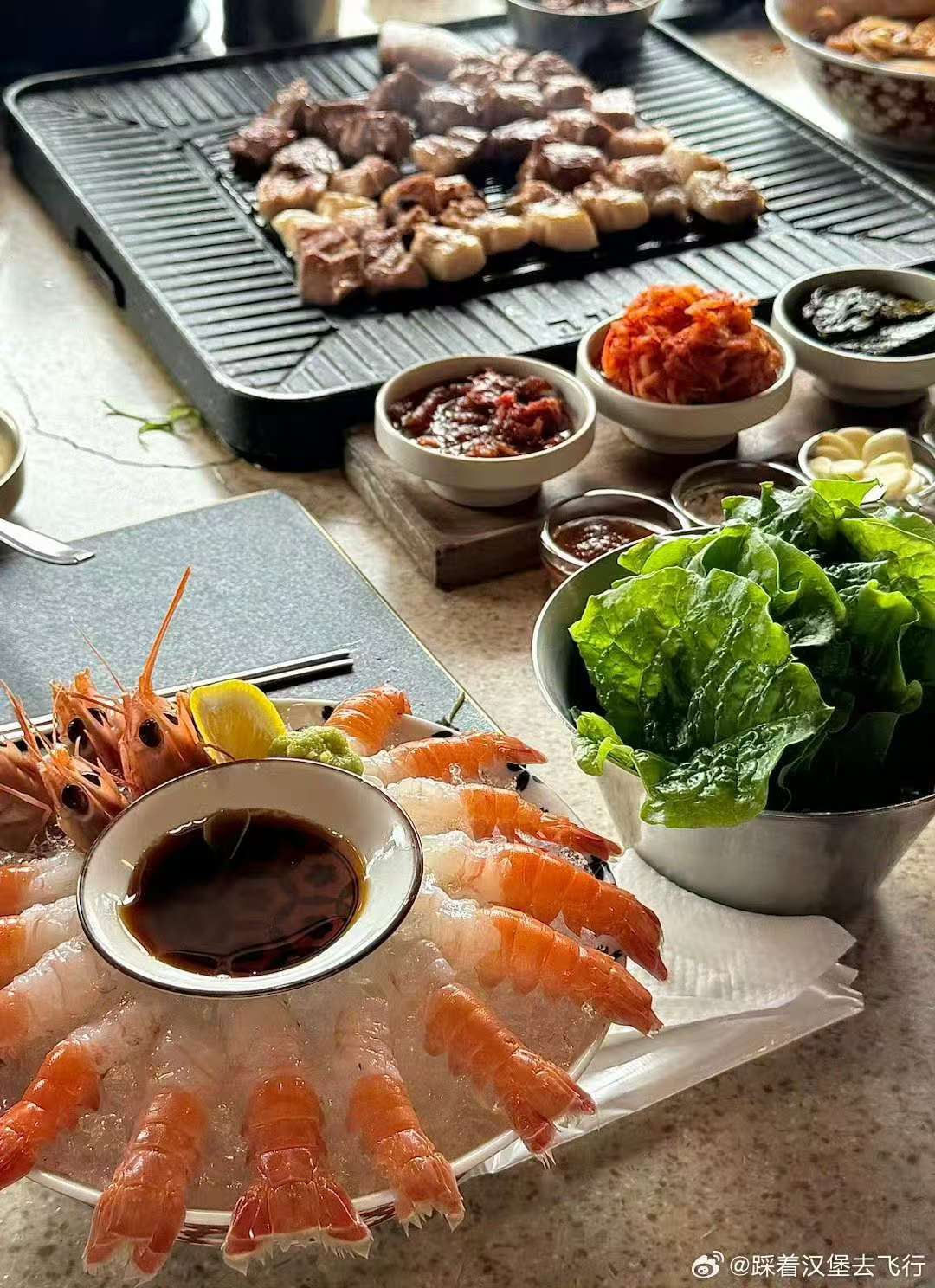 Shrimp Platter with Grilled Meat | ["shrimp","lettuce","sauce","kimchi","garlic"] | ["shrimp:300g","lettuce:100g","sauce:50g"] | |