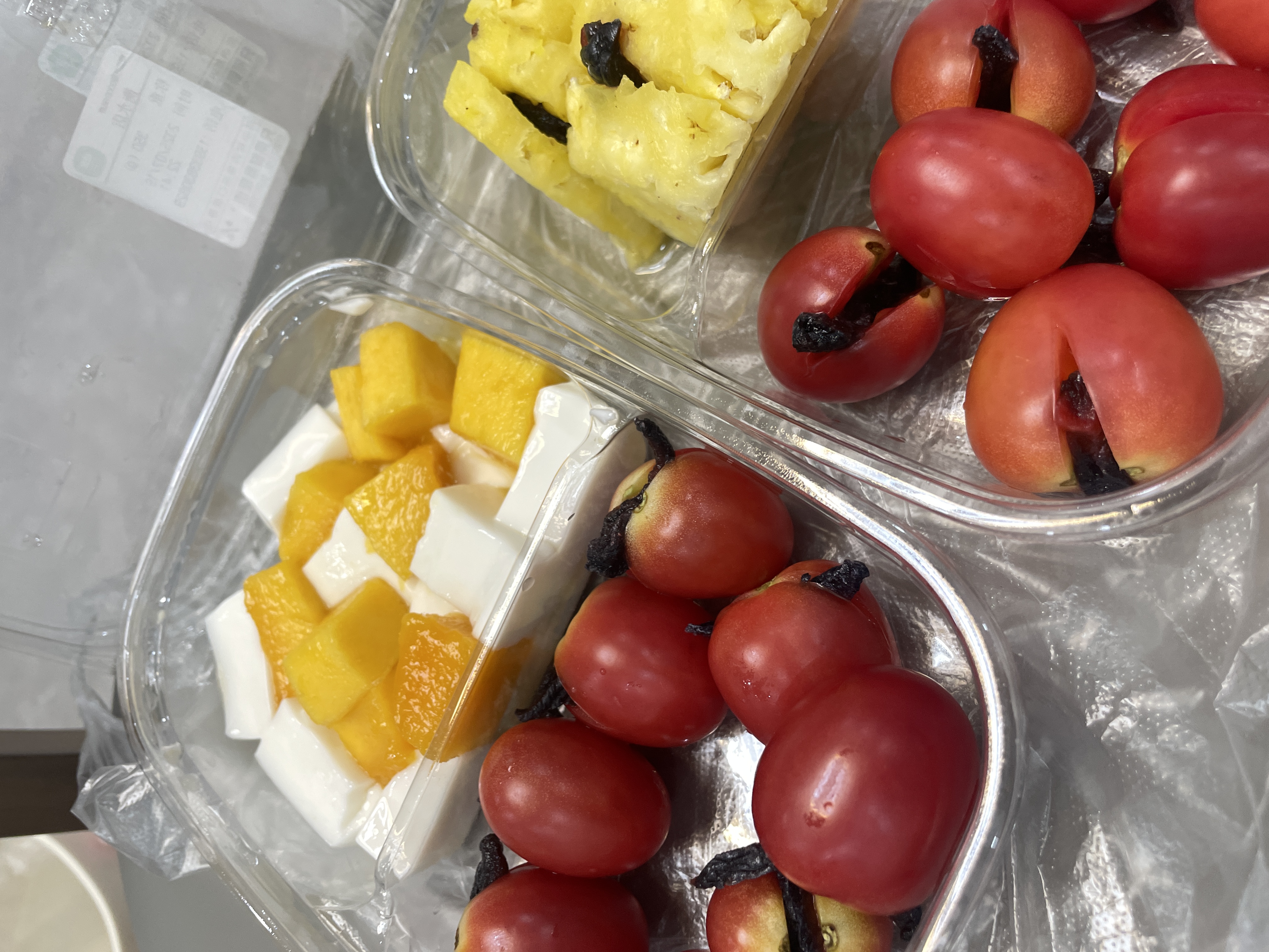 Fruit Salad | ["mango","coconut","pineapple","cherry tomatoes"] | ["mango:100g","coconut:100g","pineapple:100g","cherry tomatoes:150g"] | |