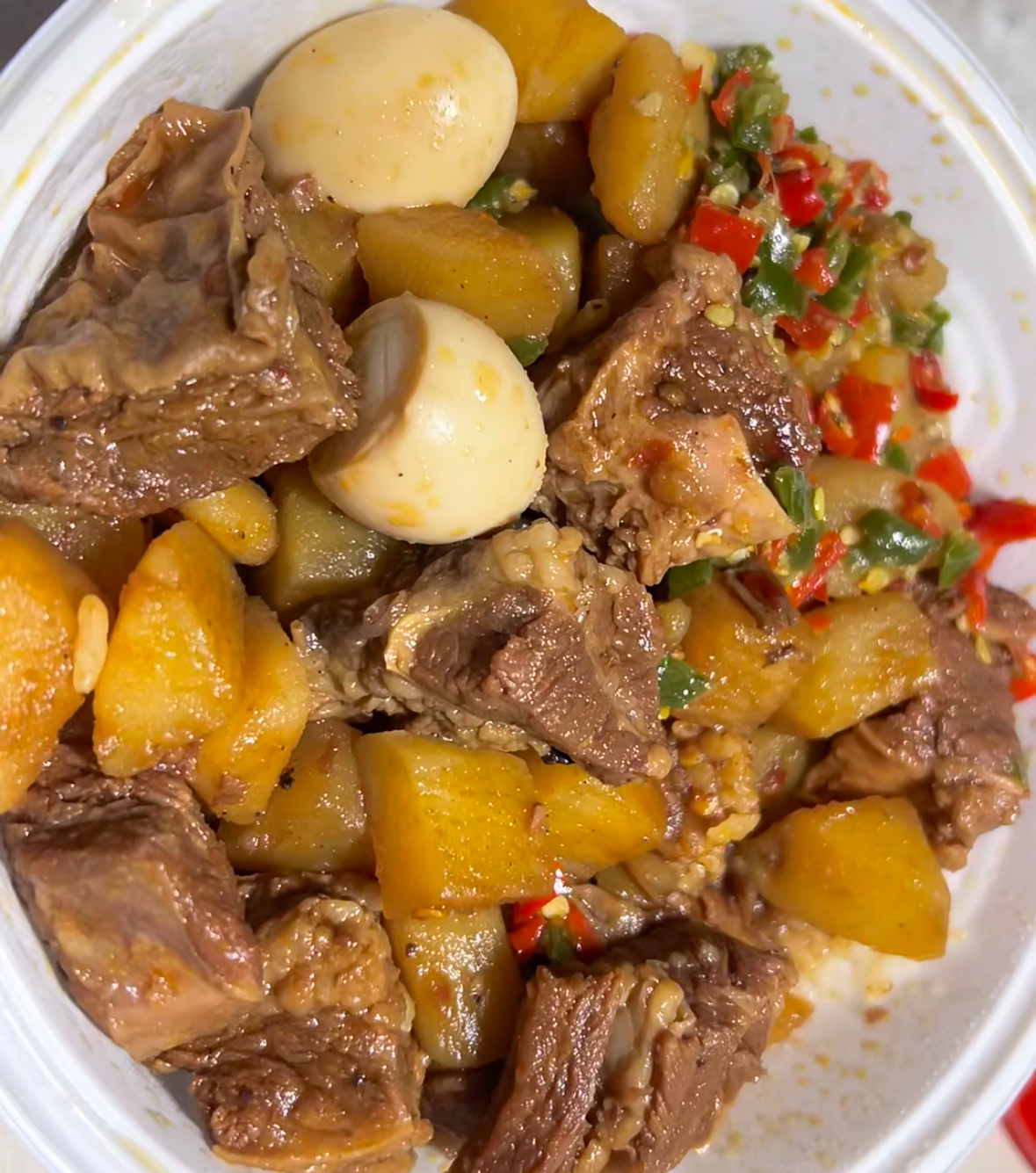 Beef and Vegetable Stew | ["beef","potatoes","eggs","bell peppers","spices"] | ["beef:250g","potatoes:150g","eggs:100g"] | |