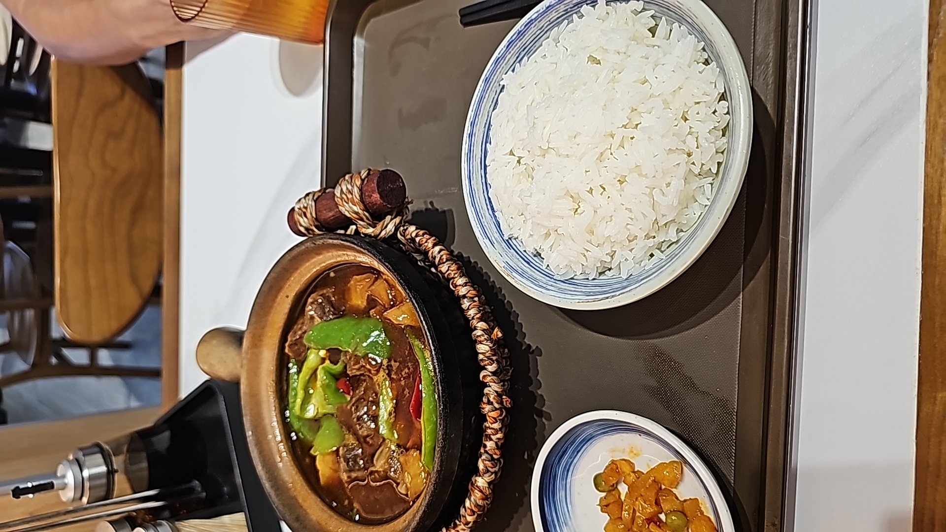 Braised Pork Belly with Rice | ["pork belly","rice","egg","snap peas"] | ["pork_belly:200g","rice:150g","egg:50g","peas:30g"] | |