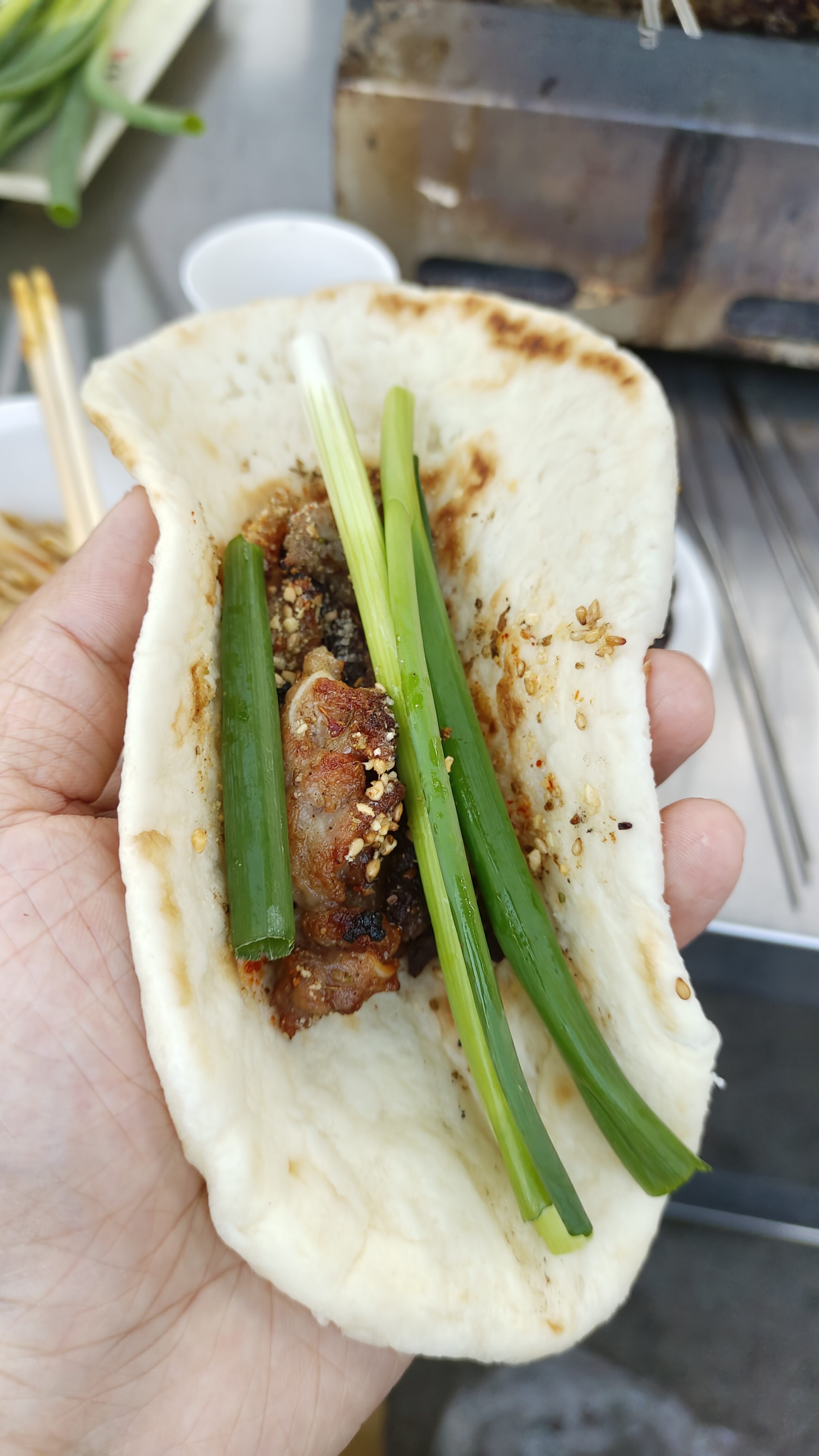 Meat Wrap | ["flatbread","meat","green onions"] | ["flatbread:100g","meat:150g","green onions:20g"] | |