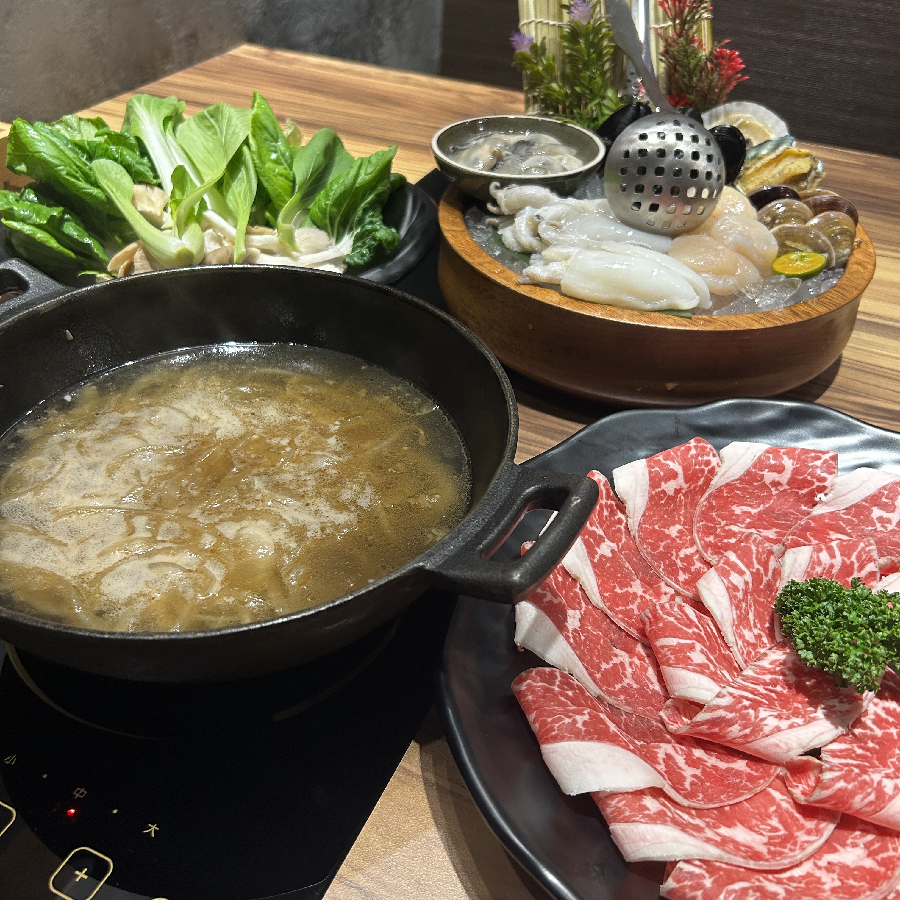 Hot Pot | ["beef","bok choy","mushrooms","seafood"] | ["beef:200g","vegetables:150g","seafood:100g"] | |