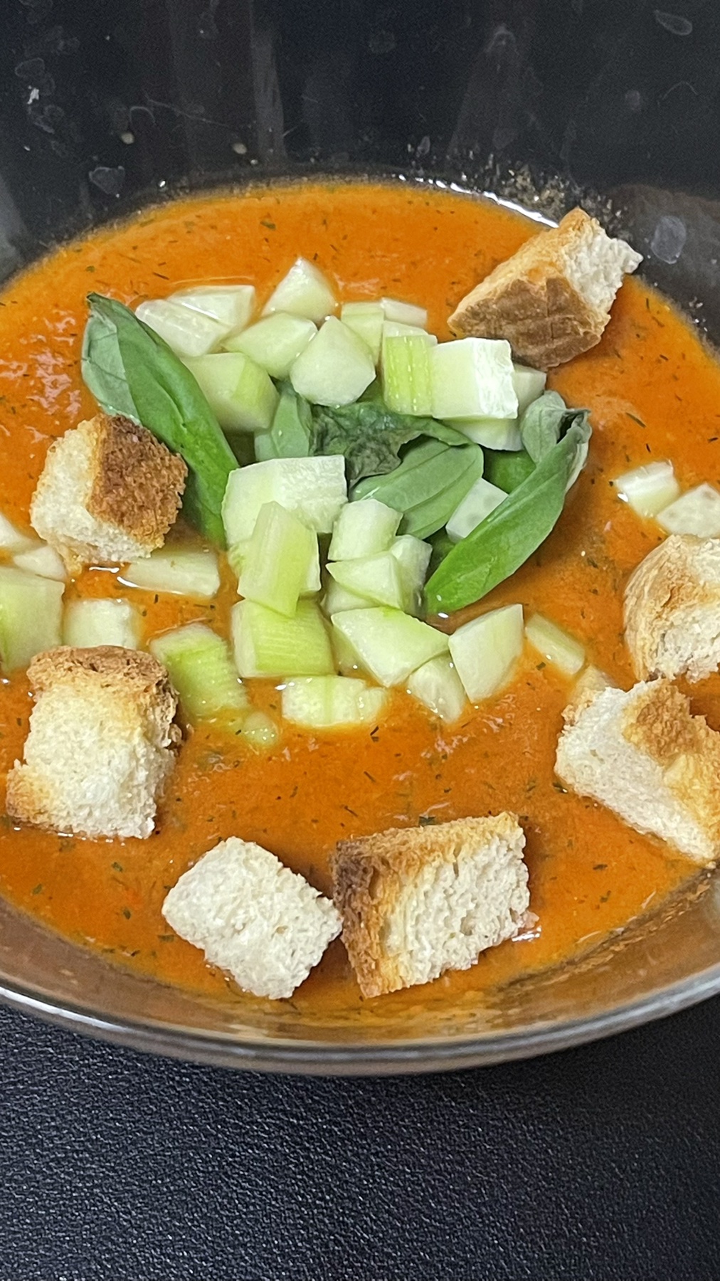 Vegetable Soup | ["vegetable broth","cucumbers","basil","croutons"] | ["soup:300g","croutons:50g"] | |