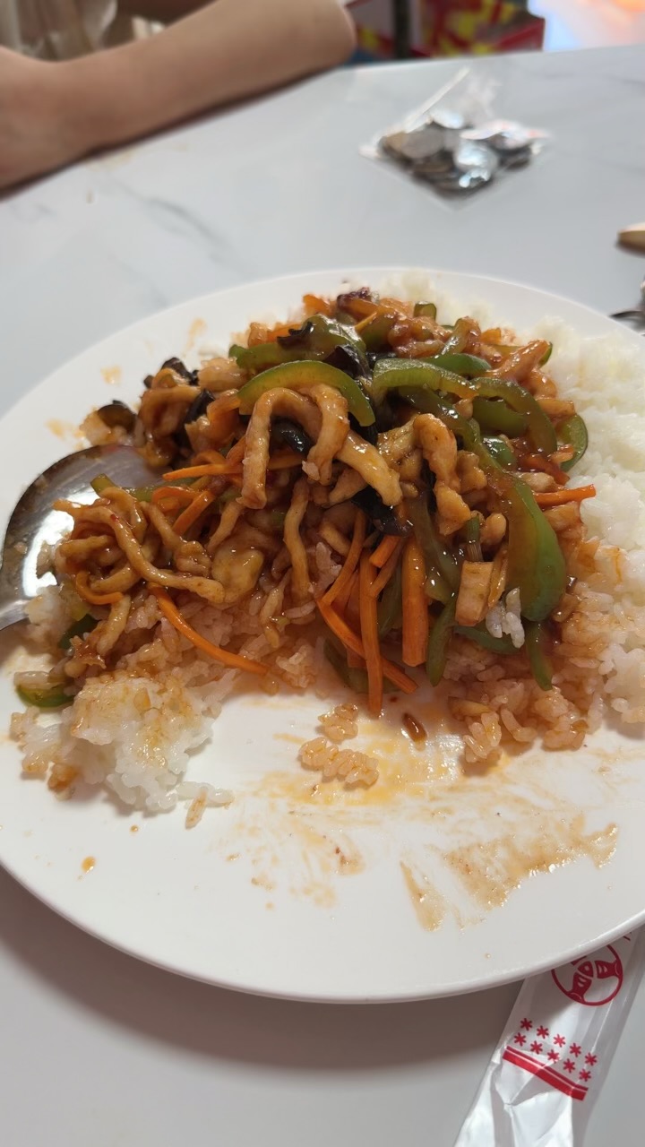 Stir-fried Chicken with Rice | ["chicken","rice","green peppers","carrots","soy sauce"] | ["chicken:200g","rice:300g","vegetables:100g"] | |