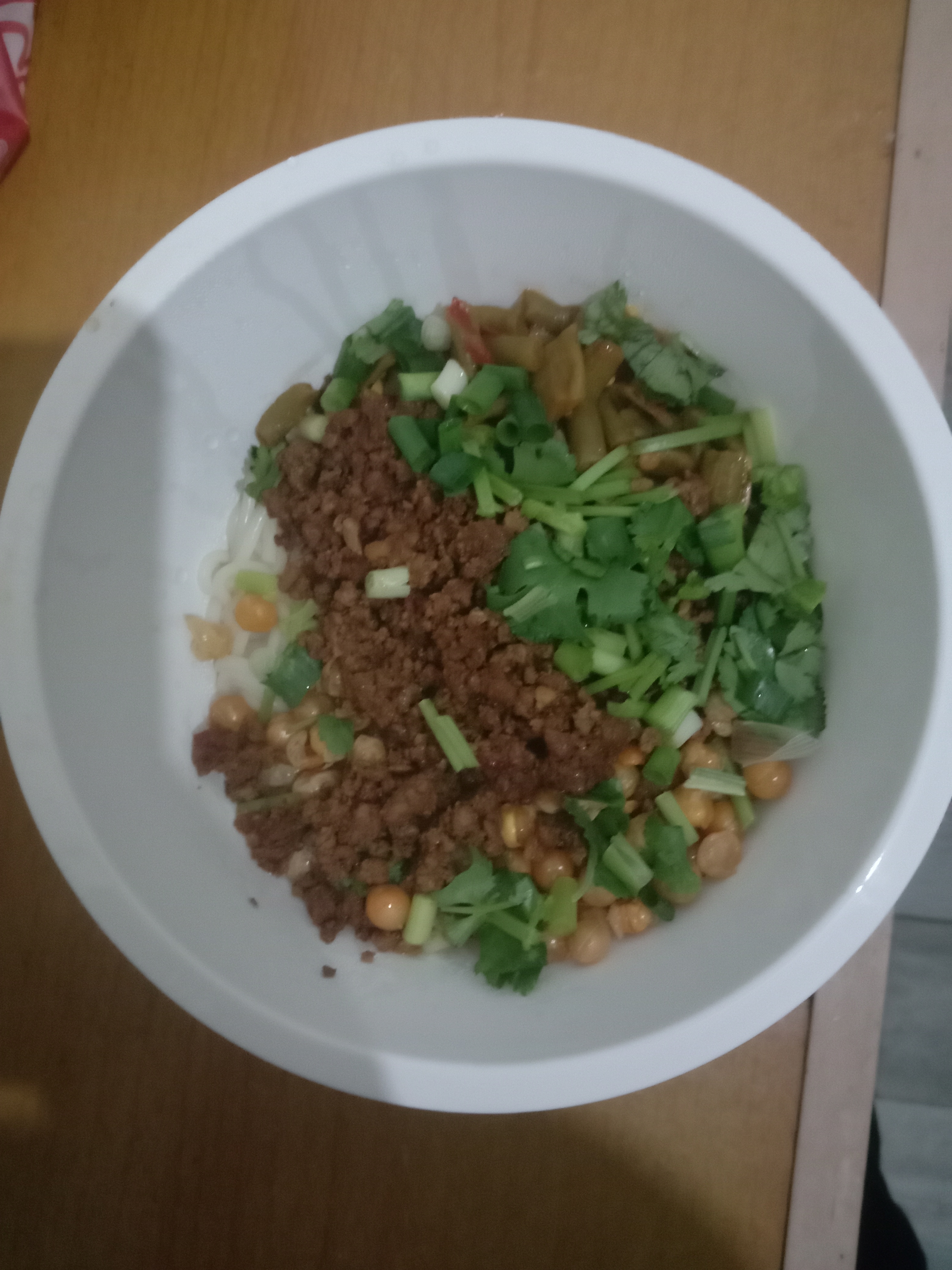 Mixed Bowl with Ground Meat and Vegetables | ["ground meat","green onions","cilantro","noodles","mixed vegetables"] | ["ground meat:200g","vegetables:150g","noodles:200g"] | |