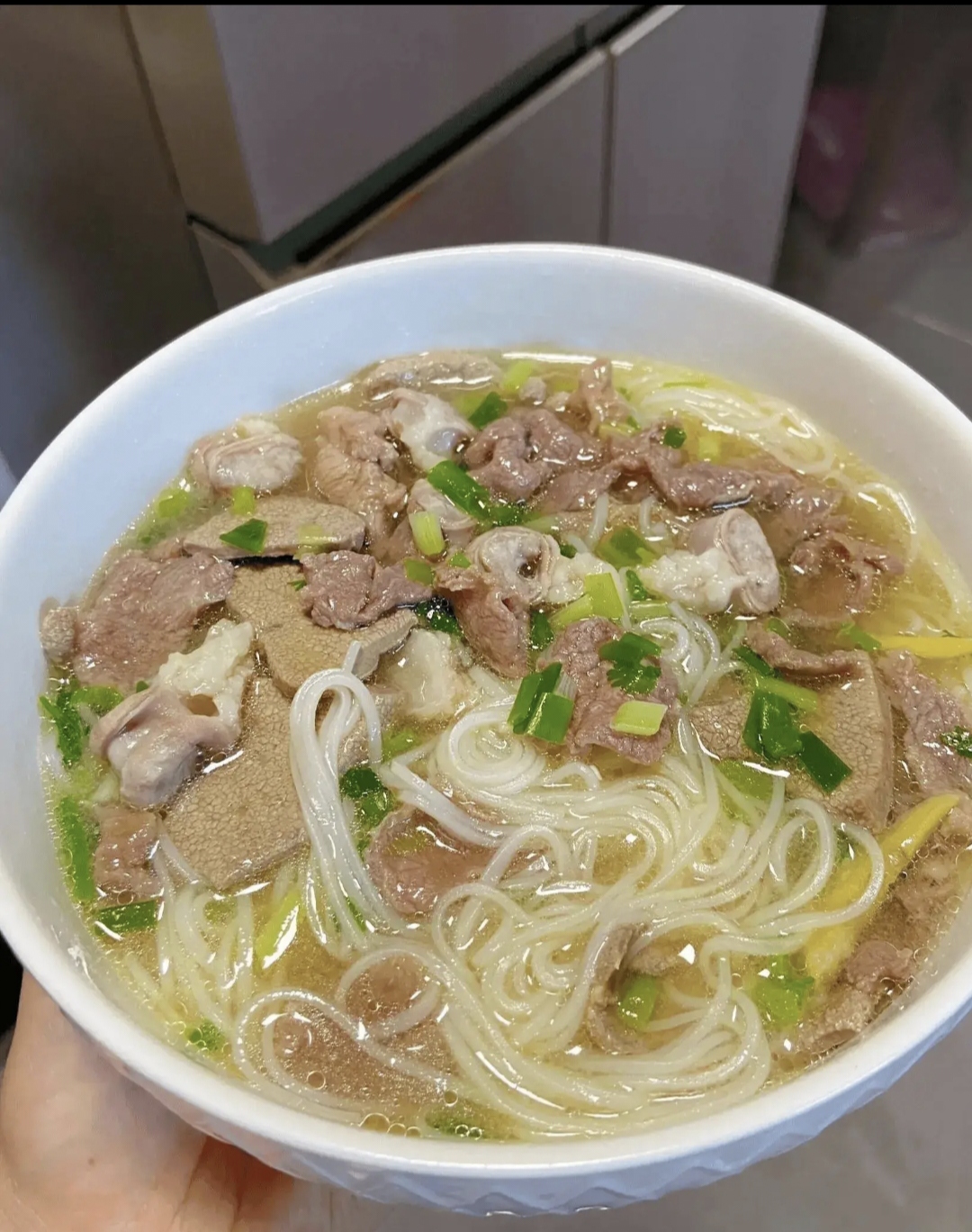 Mixed Meat Soup | ["pork","beef","liver","noodles","basil"] | ["meat:300g","vegetables:100g"] | |
