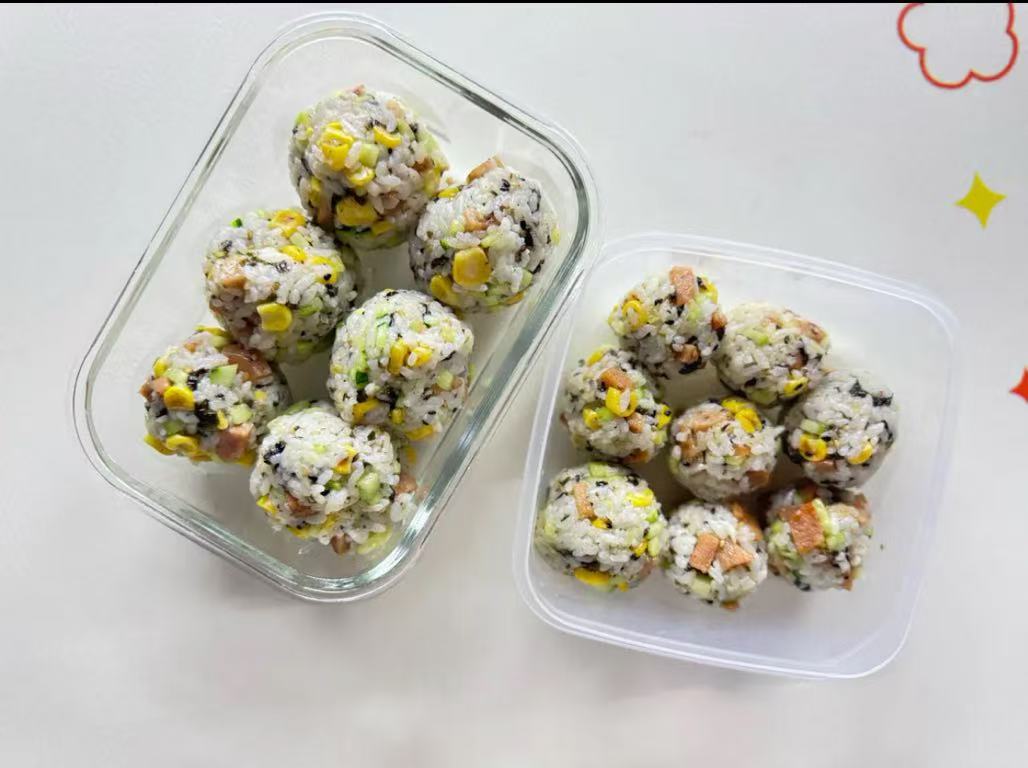 Rice Balls | ["rice","corn","seaweed","vegetables","protein"] | ["rice:200g","vegetables:50g","protein:50g"] | |