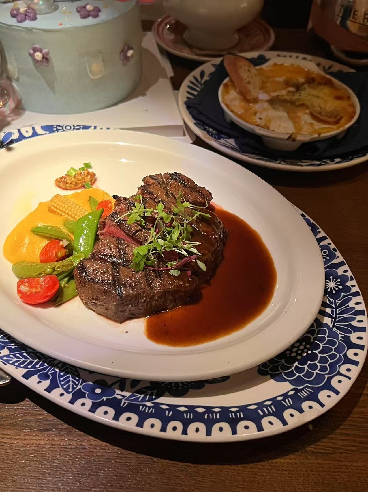Grilled Steak with Vegetables | ["steak","green beans","carrots","cherry tomatoes","sauce"] | ["steak:250g","vegetables:100g"] | |