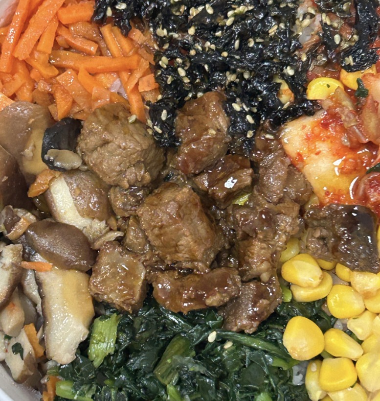 Bibimbap | ["beef","rice","carrots","spinach","corn","seaweed","kimchi"] | ["beef:150g","rice:200g","vegetables:100g","sauce:50g"] | |