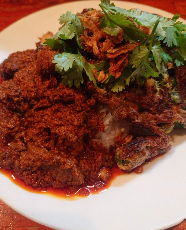 Curry with Rice | ["meat","rice","curry sauce","cilantro","fried onions"] | ["meat:250g","rice:150g","sauce:100g"] | |
