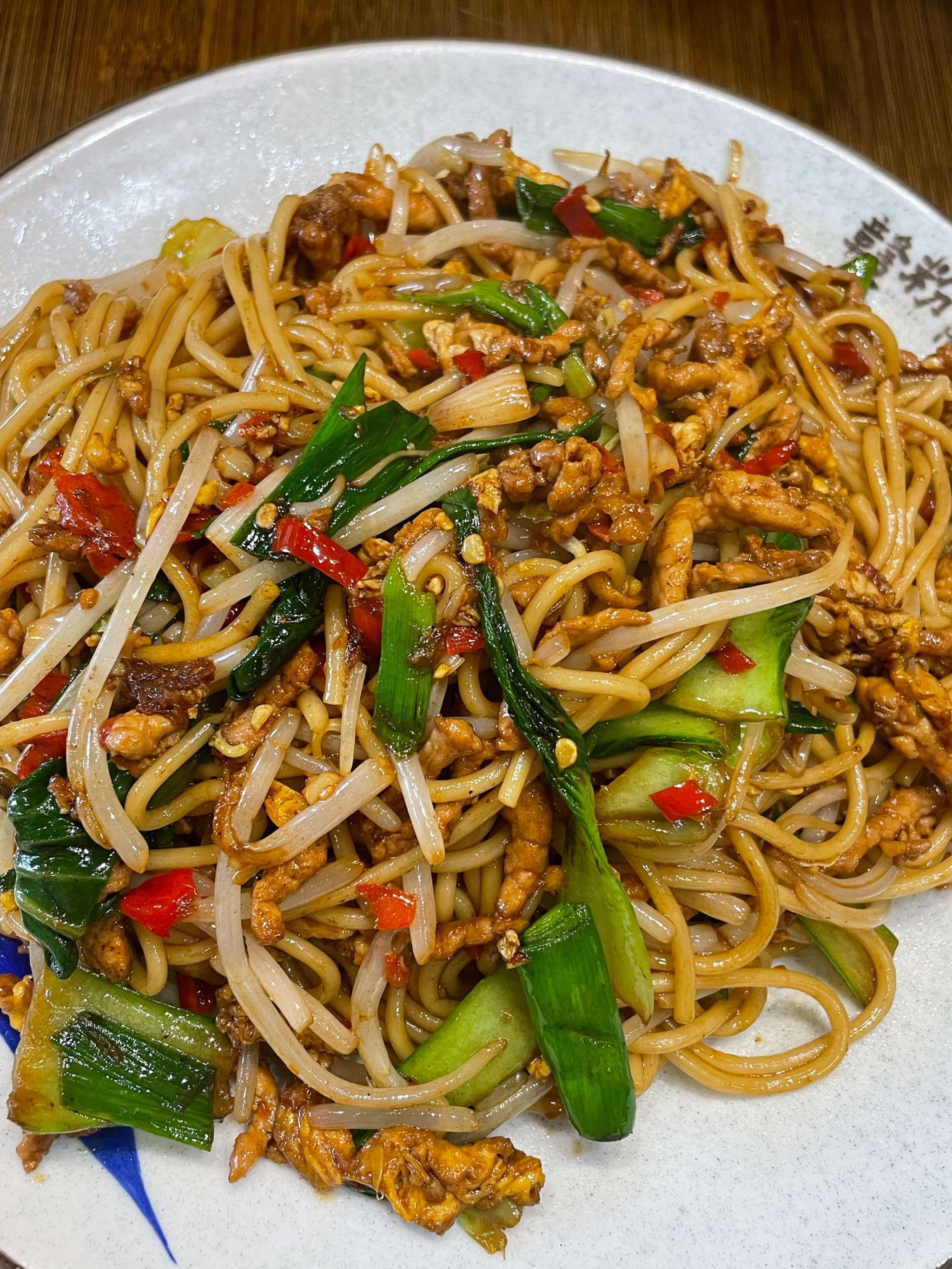 Stir-fried Noodles | ["noodles","chicken","bell peppers","green onions","bean sprouts"] | ["noodles:200g","chicken:100g","vegetables:150g"] | |