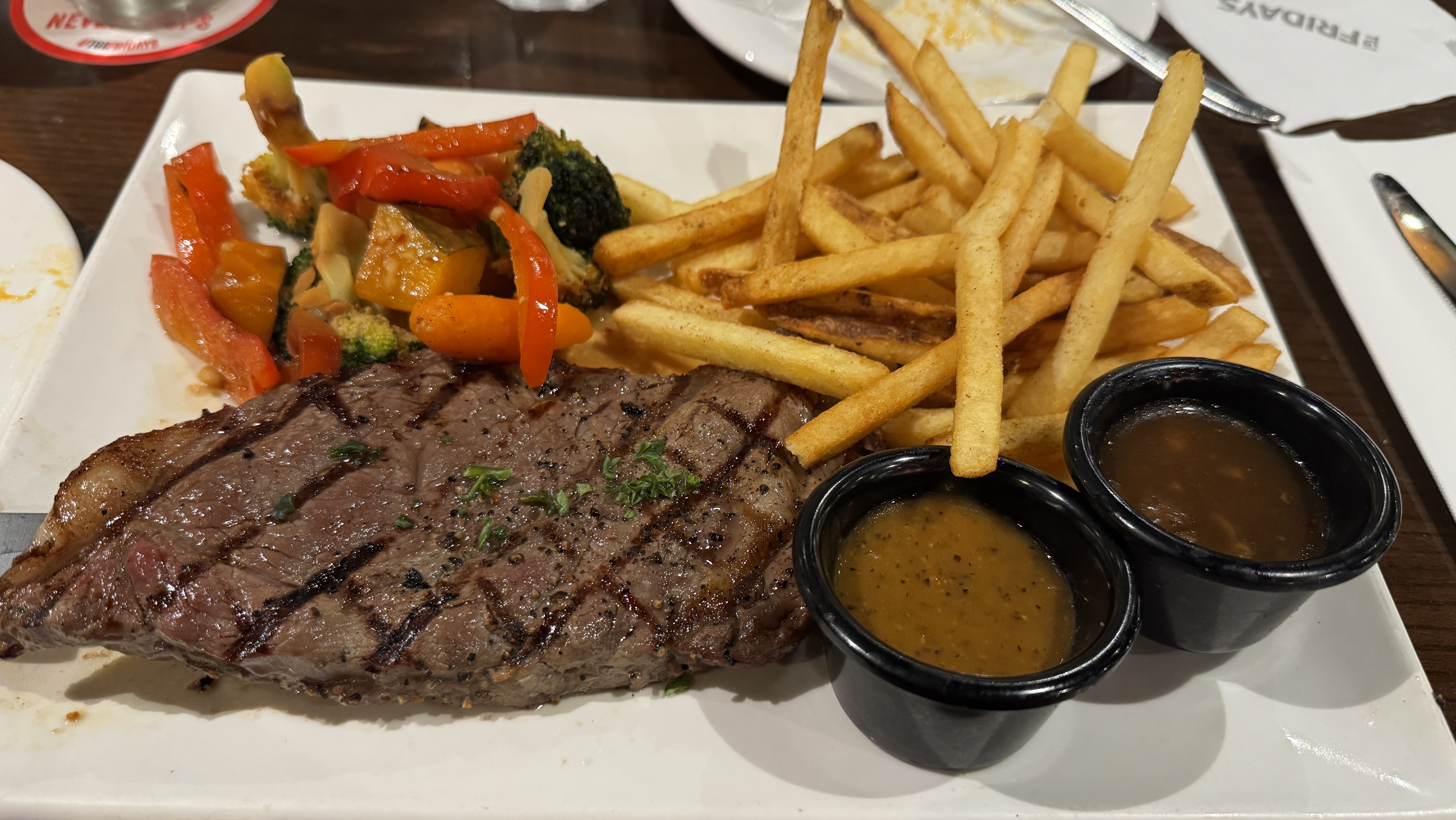 Steak with Fries and Vegetables | ["steak","fries","mixed vegetables"] | ["steak:250g","fries:150g","vegetables:100g"] | |