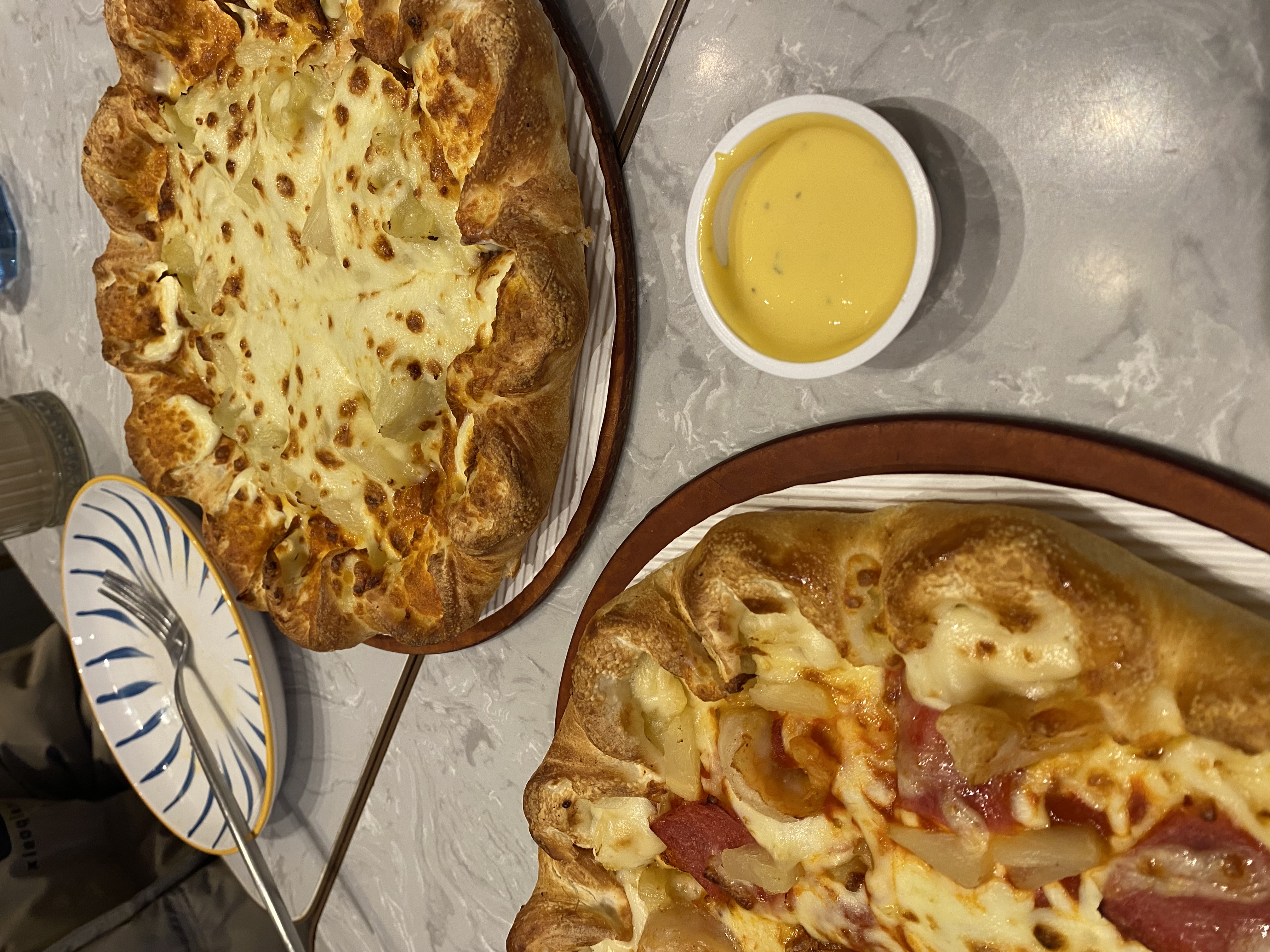 Cheese and Pepperoni Pizza | ["pizza dough","cheese","pepperoni","pineapple","dipping sauce"] | ["pizza:600g","dipping sauce:50g"] | |