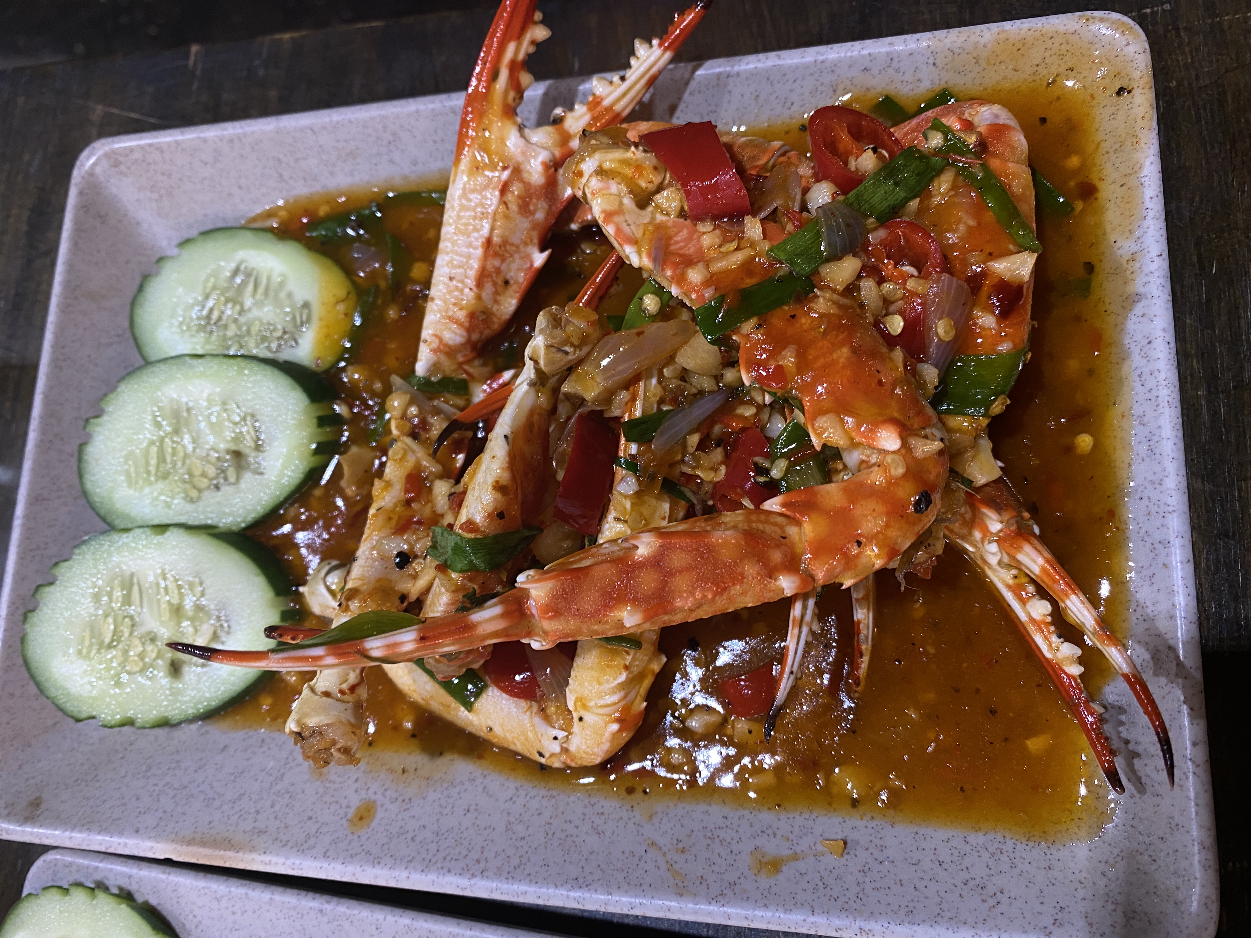 Spicy Crab | ["crab","spicy sauce","cucumber","chili","garlic","herbs"] | ["crab:250g","sauce:50g","cucumber:100g"] | |