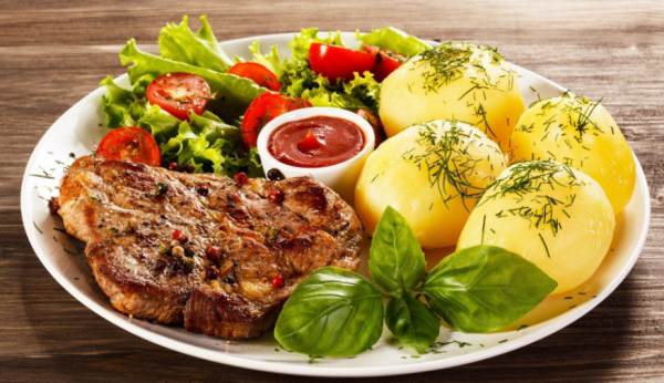Grilled Meat with Potatoes and Salad | ["grilled meat","potatoes","salad","tomatoes","basil","sauce"] | ["meat:200g","potatoes:300g","salad:100g"] | |
