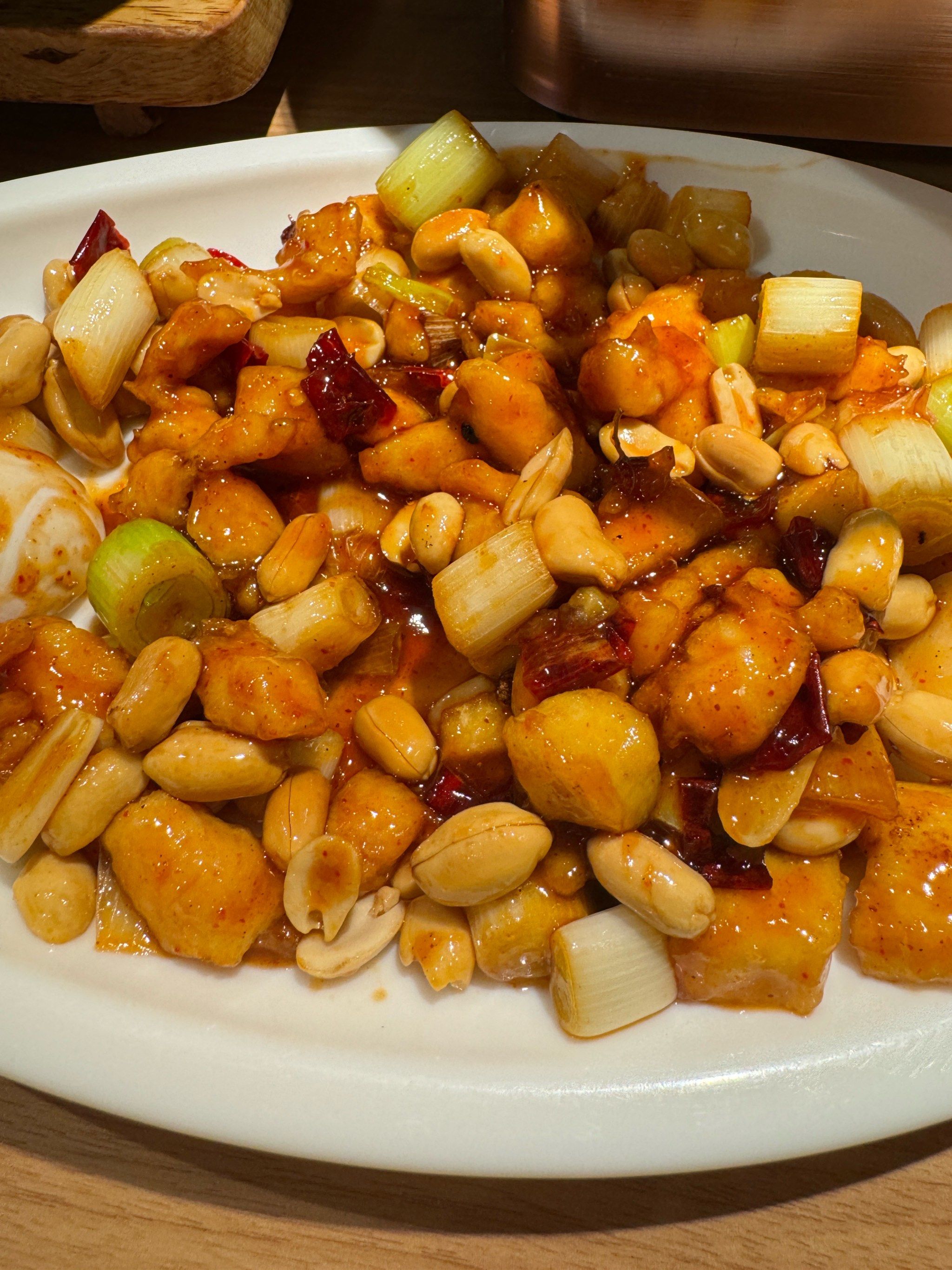Kung Pao Chicken | ["chicken","peanuts","green onions","dried chili peppers","sauce"] | ["chicken:250g","peanuts:100g","vegetables:100g"] | |