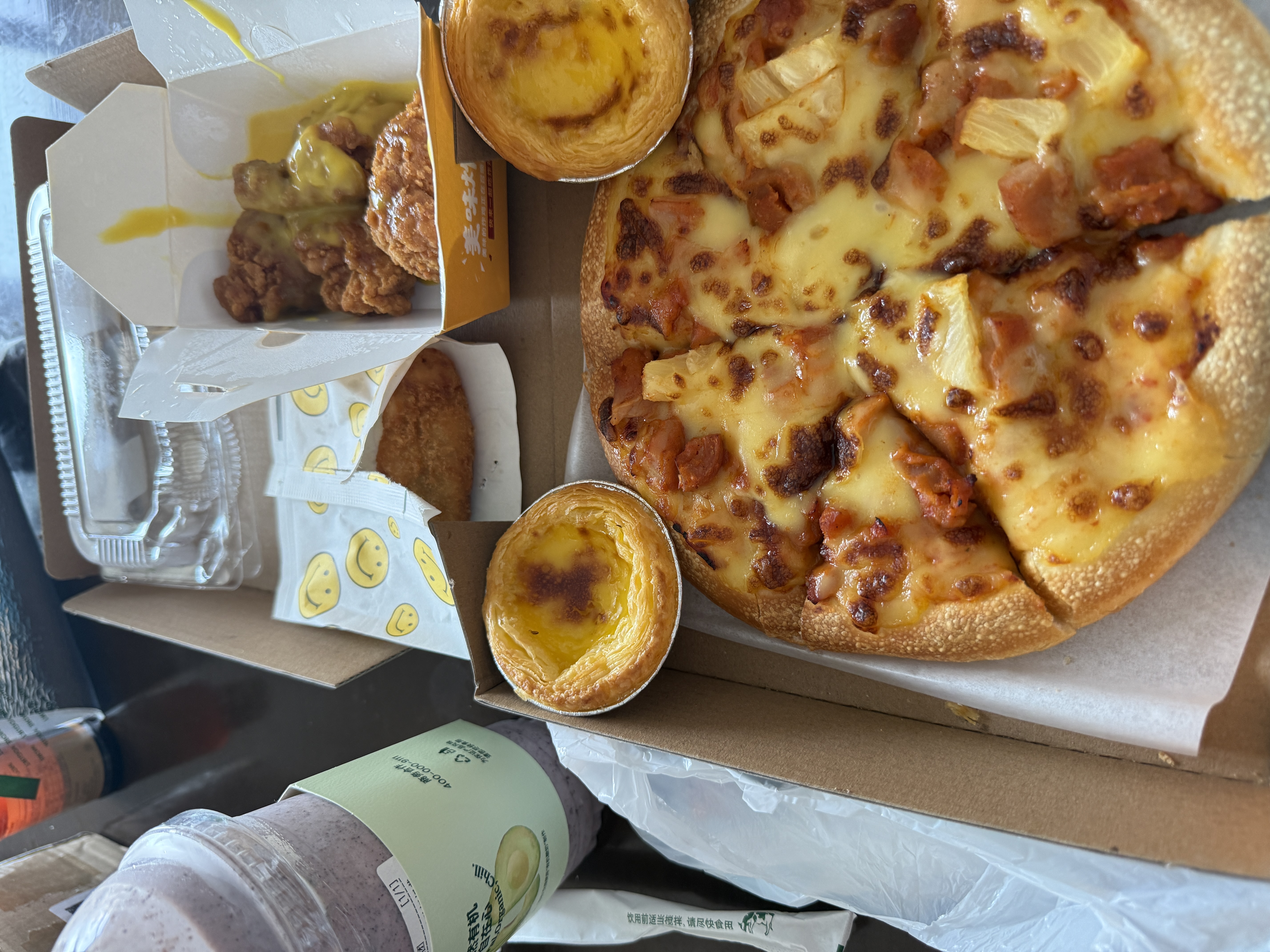 Mixed Fast Food Meal | ["pizza","fried chicken","egg tart","smoothie"] | ["pizza:300g","fried chicken:150g","dessert:100g"] | |
