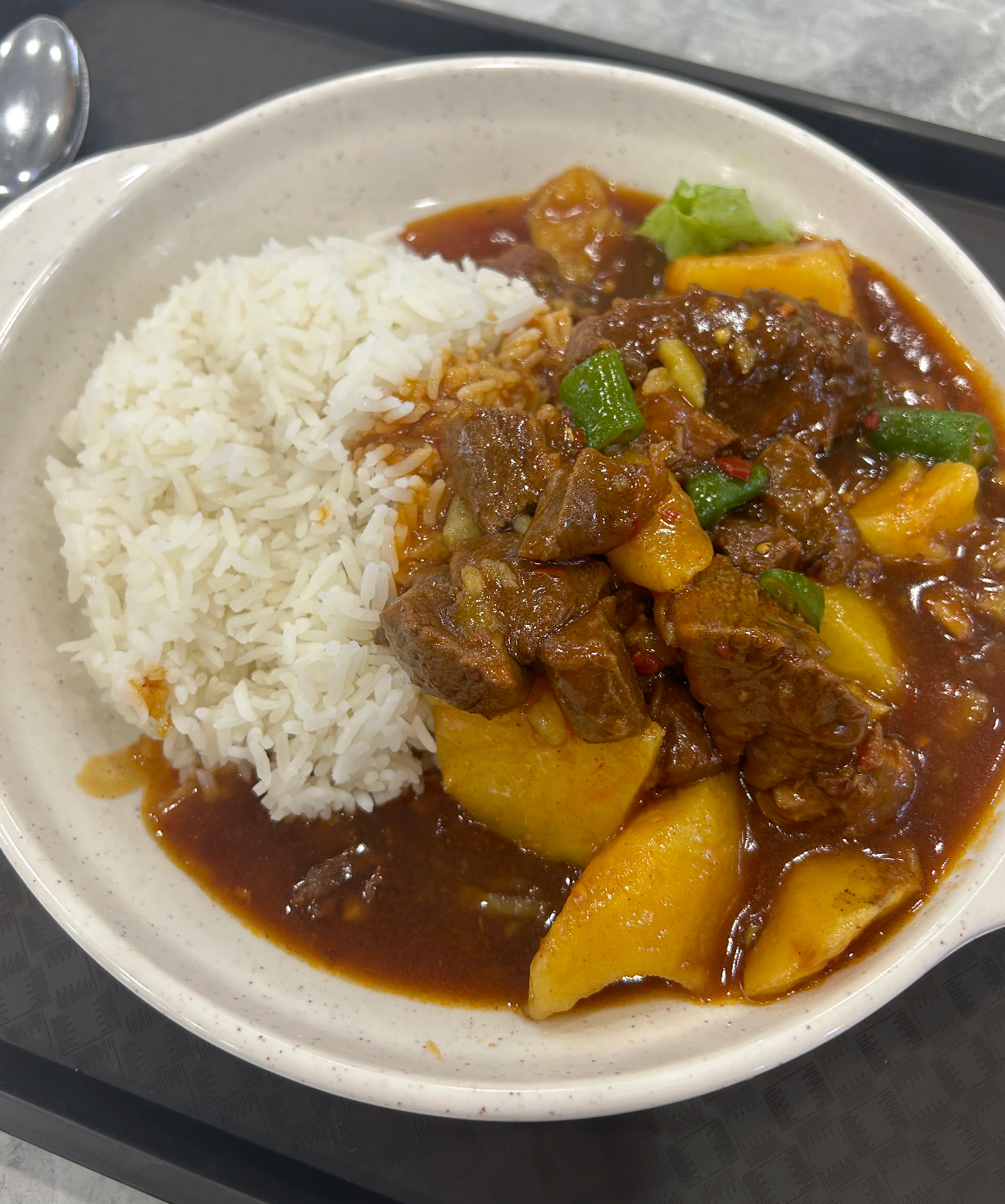 Beef Stew with Rice | ["rice","beef","potatoes","vegetables","sauce"] | ["rice:250g","beef:150g","vegetables:100g"] | |