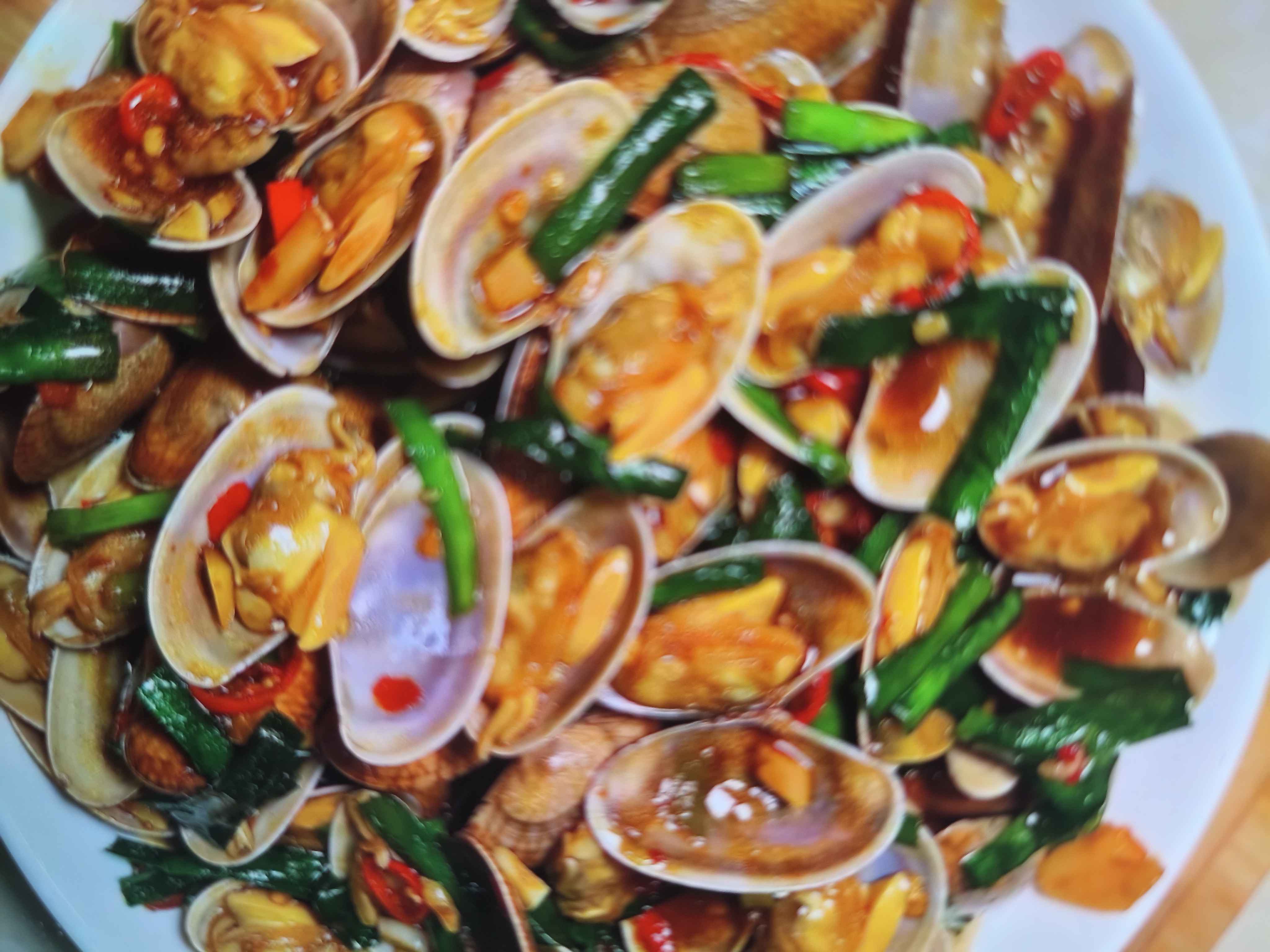 Stir-fried Clams with Vegetables | ["clams","green beans","red chili","garlic","soy sauce"] | ["clams:300g","vegetables:100g"] | |