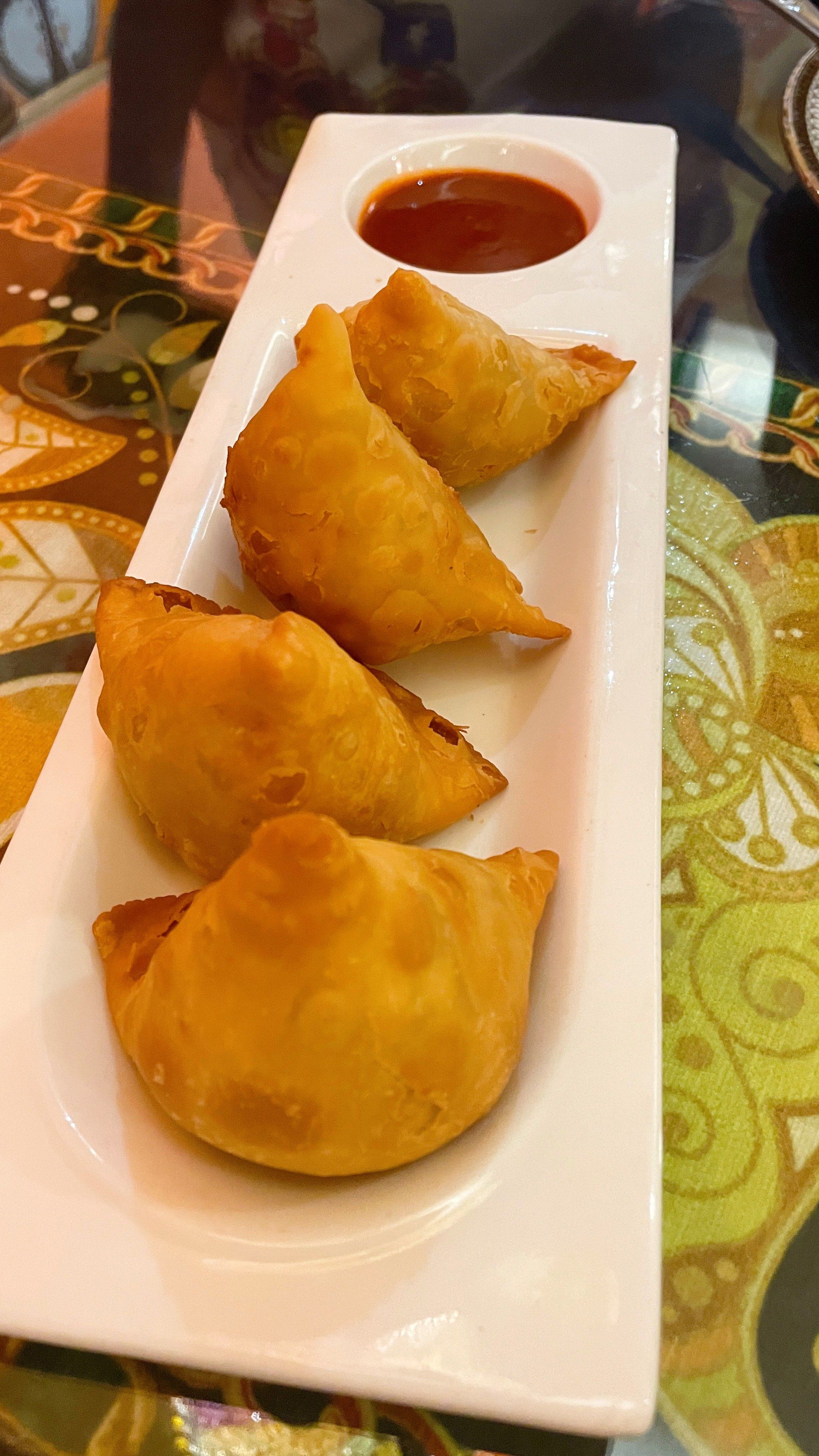 Samosas | ["potatoes","peas","spices","flour","oil"] | ["samosa:200g","sauce:50g"] | |
