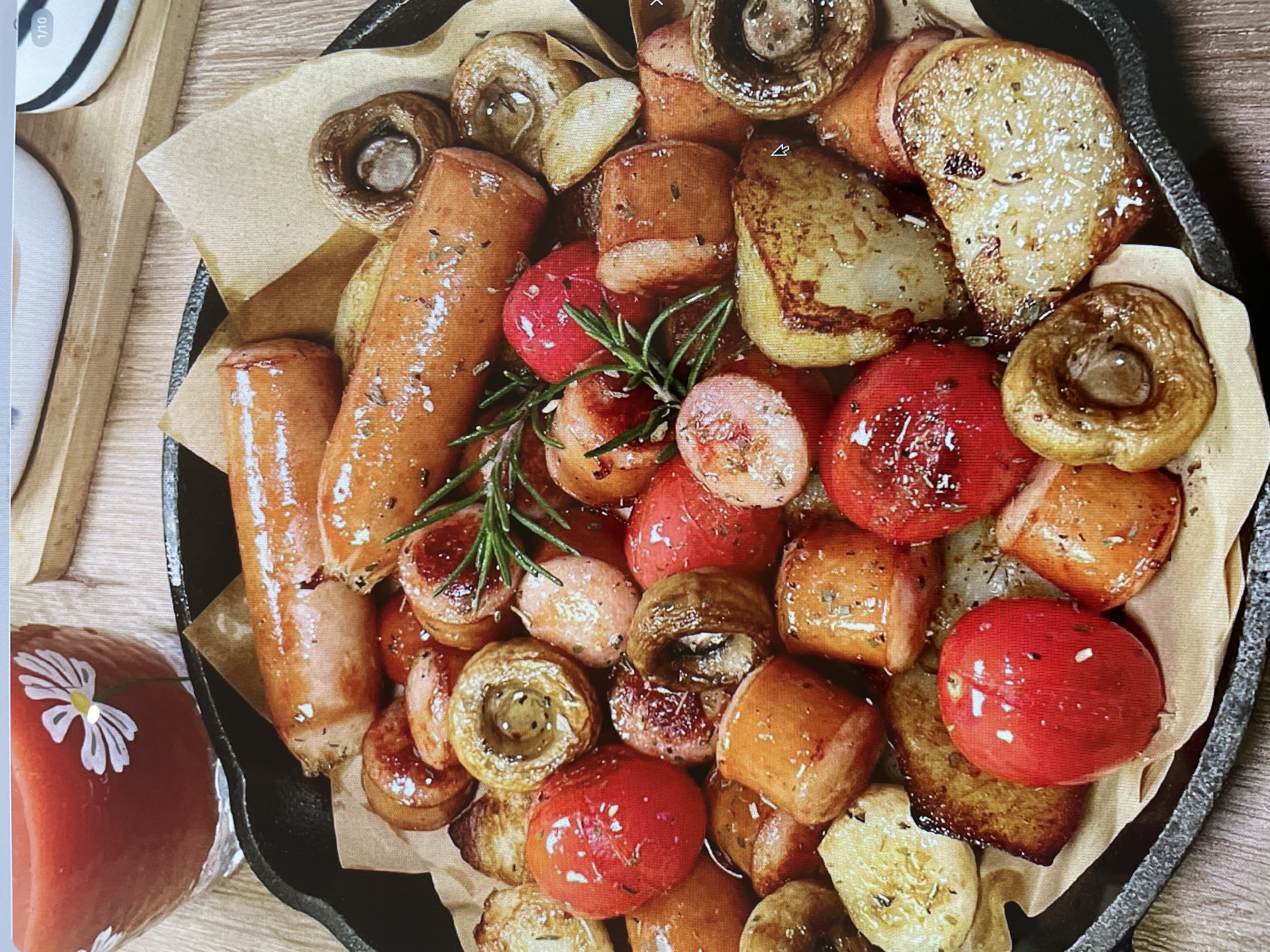 Roasted Sausages and Vegetables | ["sausages","potatoes","tomatoes","mushrooms","rosemary"] | ["sausages:200g","potatoes:150g","tomatoes:100g","mushrooms:100g"] | |
