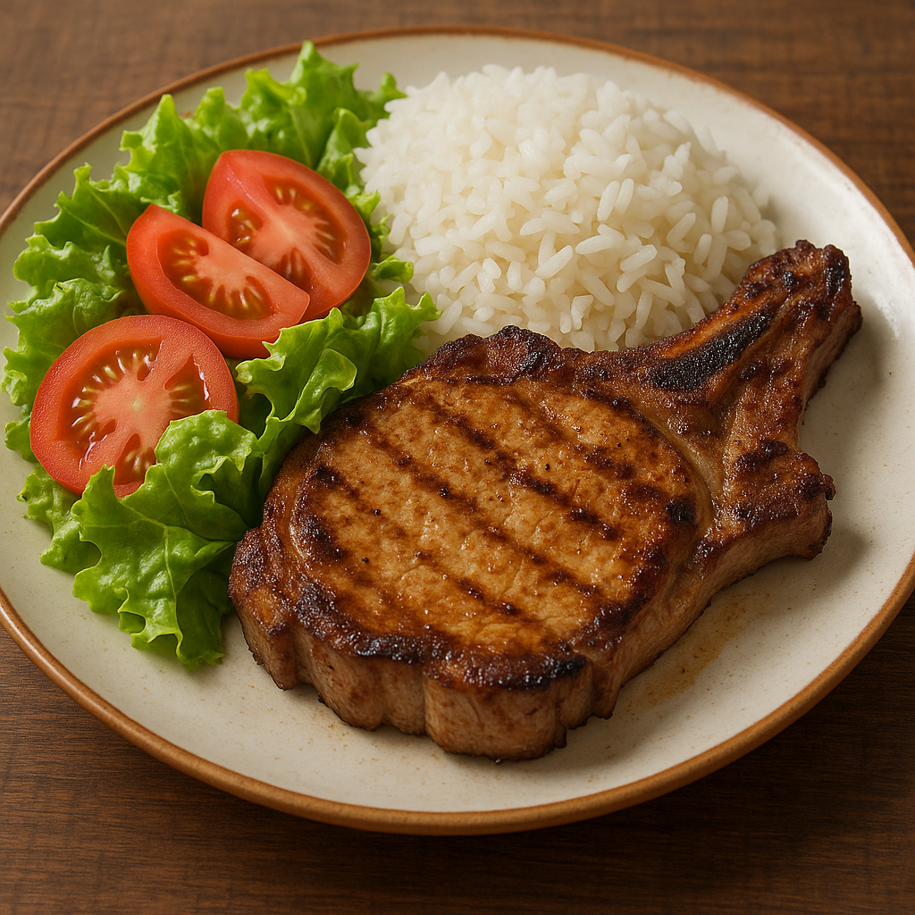 Grilled Pork Chop with Rice | ["pork chop","rice","lettuce","tomato"] | ["pork chop:200g","rice:150g","lettuce:50g","tomato:100g"] | |
