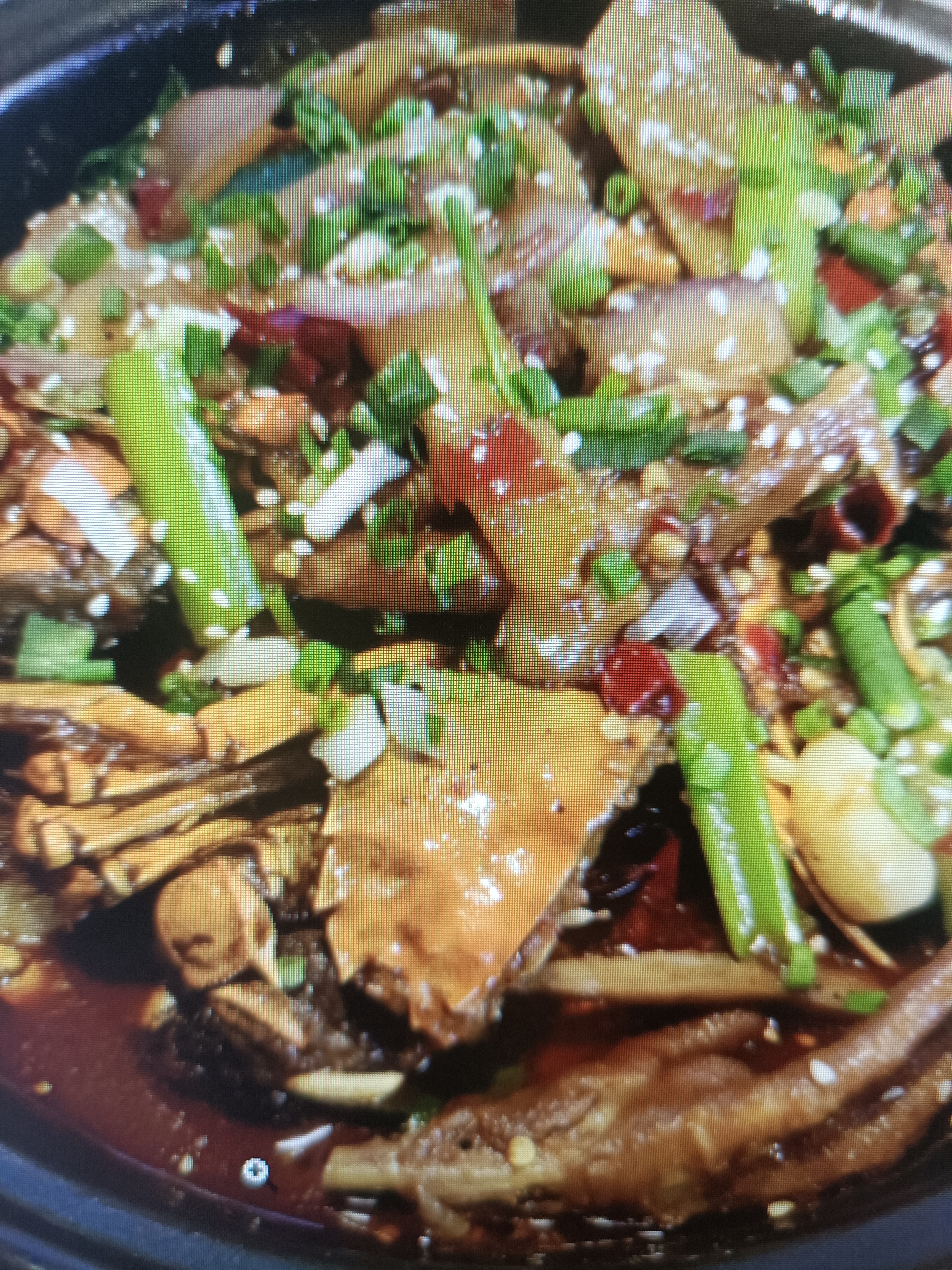 Spicy Crab Stir-fry | ["crab","green onions","chili peppers","garlic","soy sauce"] | ["crab:300g","vegetables:200g"] | |