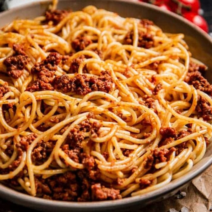 Spaghetti Bolognese | ["spaghetti","ground beef","tomato sauce","onion","garlic"] | ["spaghetti:300g","ground beef:100g","sauce:50g"] | |