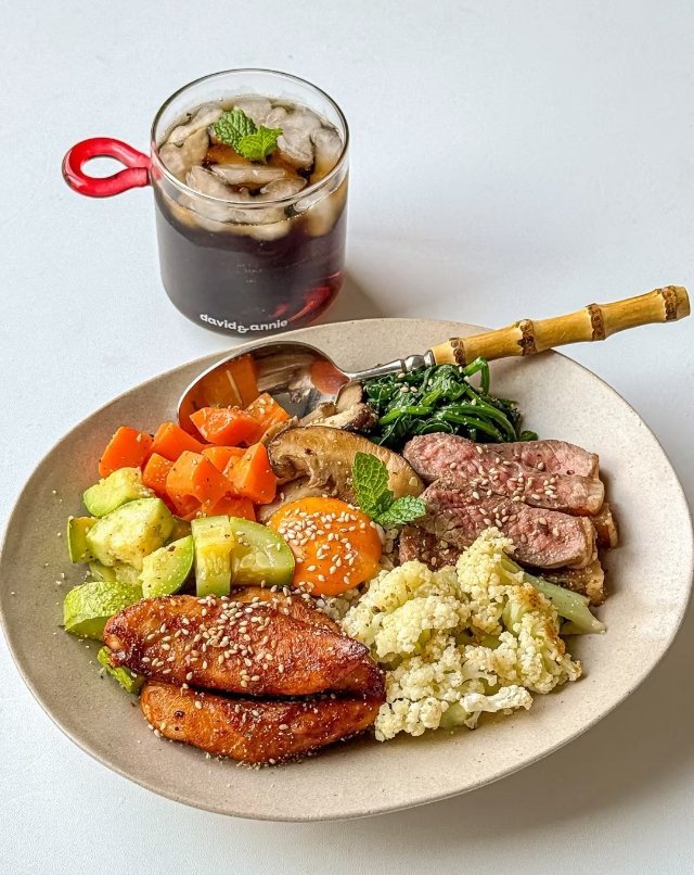 Mixed Asian Cuisine | ["beef","fried chicken","vegetables","sauce","drink"] | ["beef:200g","fried chicken:150g","vegetables:100g","sauce:50g","drink:250ml"] | |