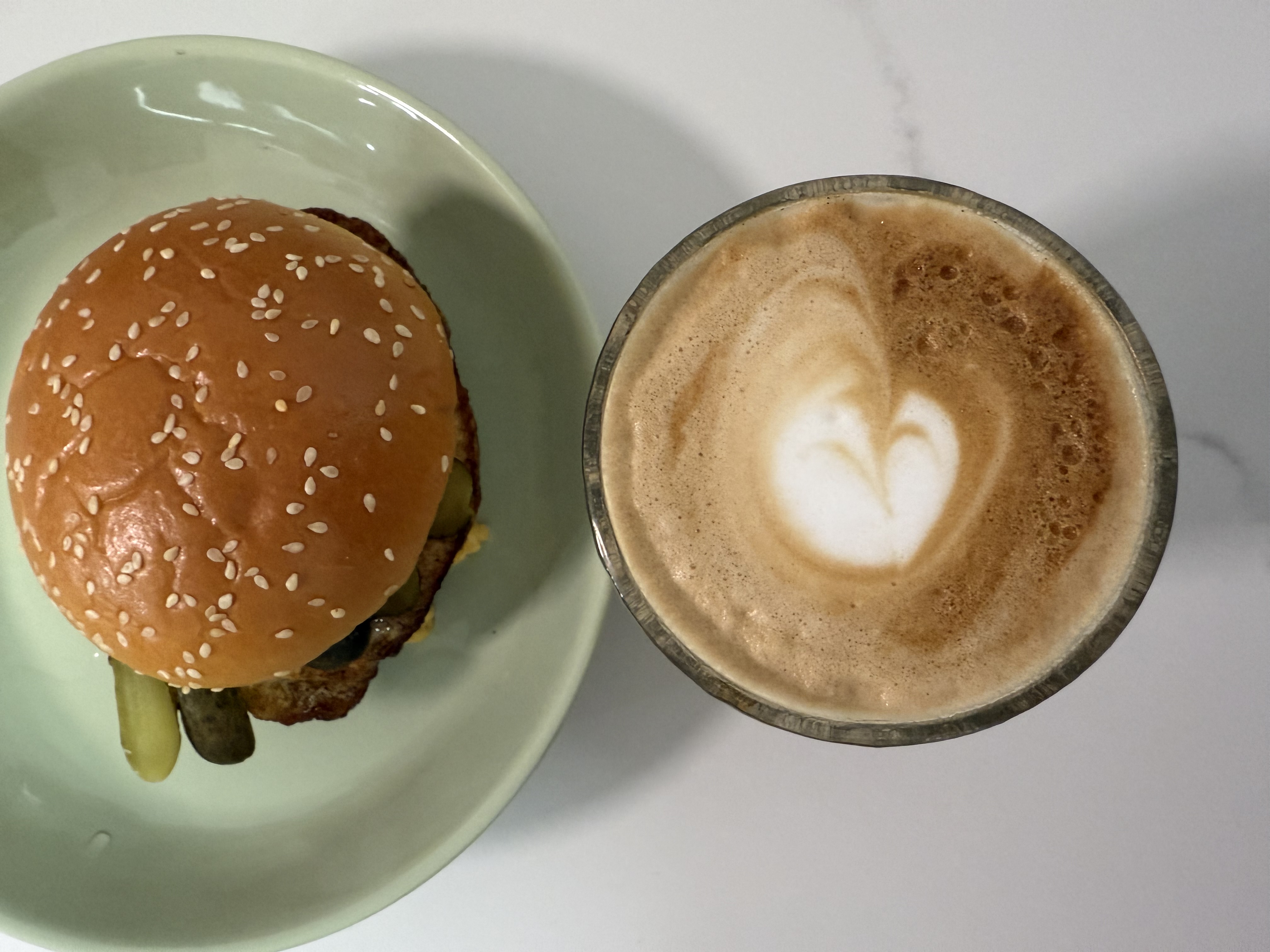 Burger with Pickles | ["burger bun","meat patty","pickles","cheese","coffee"] | ["burger:250g","coffee:200g"] | |