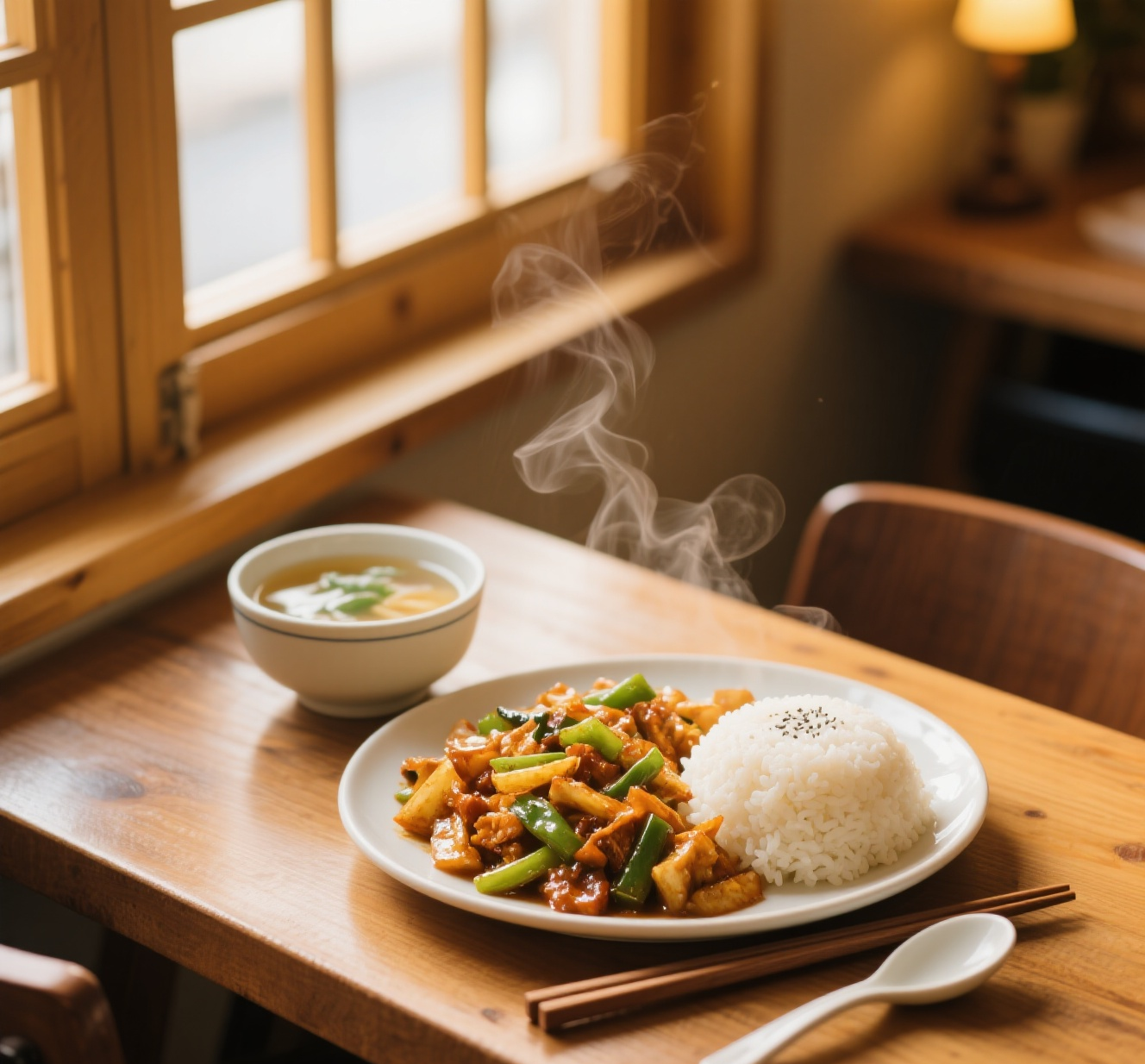 Chicken Stir-Fry with Rice | ["chicken","green bell pepper","onion","rice","soy sauce"] | ["chicken:200g","vegetables:150g","rice:200g"] | |