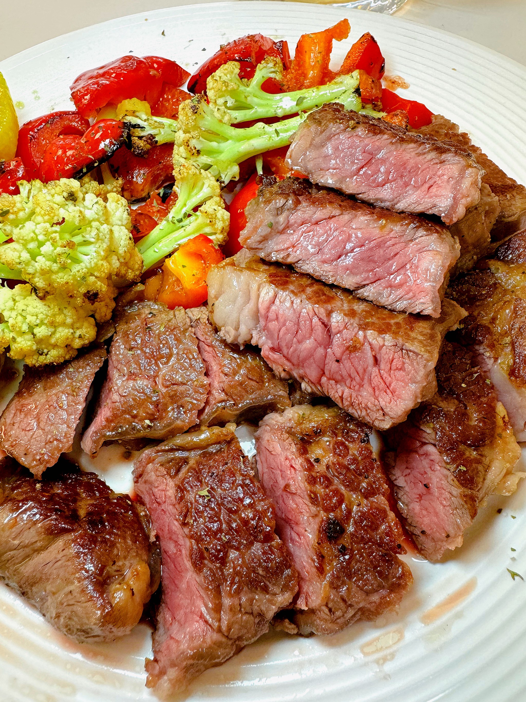Steak with Roasted Vegetables | ["steak","bell peppers","broccoli","cauliflower"] | ["steak:300g","mixed vegetables:150g"] | |
