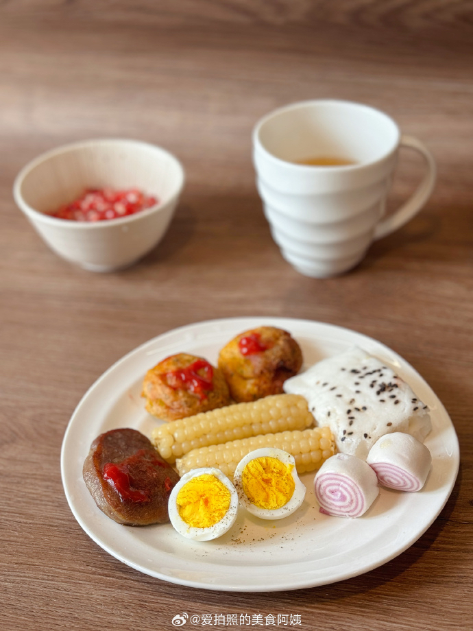 Mixed Breakfast Plate | ["corn","boiled eggs","meat patty","snack rolls","ketchup"] | ["corn:150g","boiled eggs:100g","meat patty:100g","snack rolls:50g"] | |