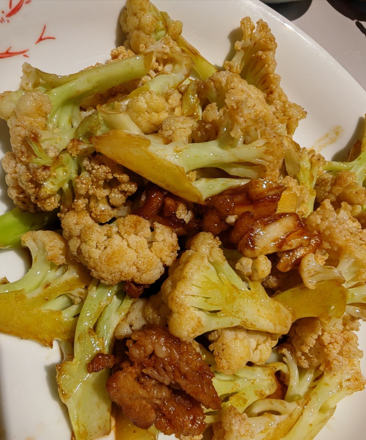 Cauliflower Stir-Fry | ["cauliflower","chicken","soy sauce","vegetable oil"] | ["cauliflower:300g","chicken:100g"] | |