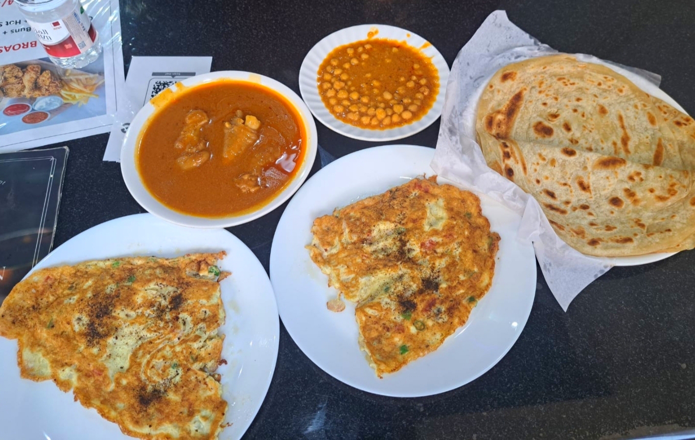 Omelet with curry and bread | ["eggs","vegetables","chicken","spices","bread"] | ["omelet:200g","curry:150g","bread:150g"] | |