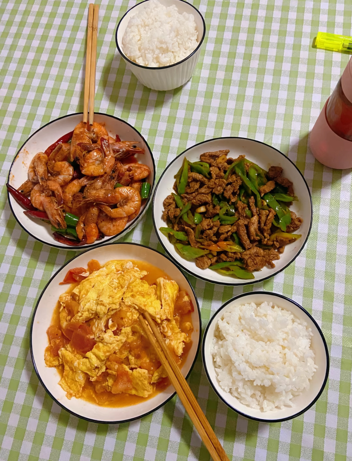 Shrimp with vegetables, Beef stir-fry, Tomato egg stir-fry, Rice | ["shrimp","beef","eggs","tomato","rice","green peppers"] | ["shrimp:200g","beef:150g","eggs:100g","rice:200g"] | |
