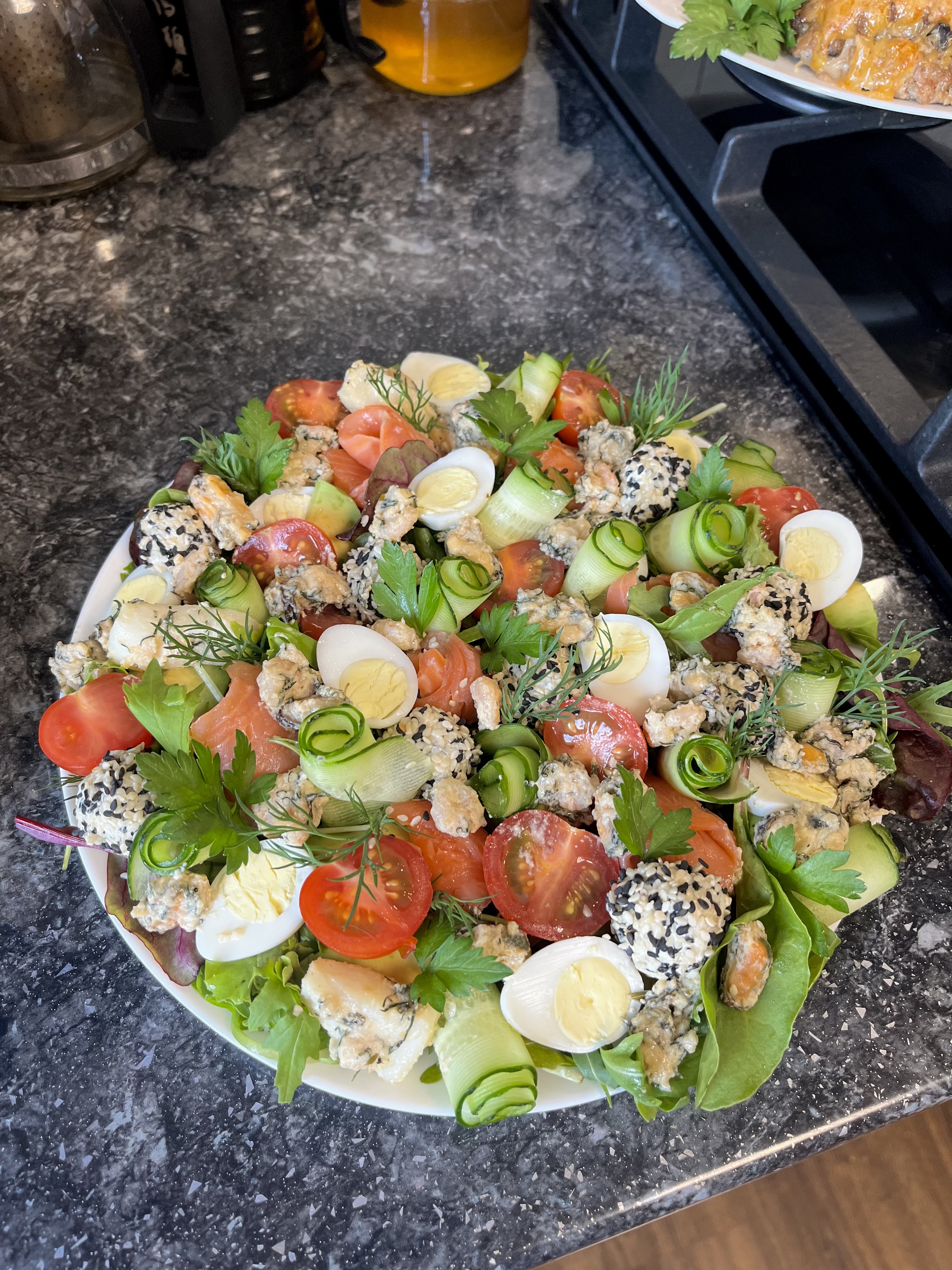 Mixed Salad | ["salad greens","cherry tomatoes","boiled eggs","cucumber","herbs"] | ["salad greens:150g","cherry tomatoes:100g","boiled eggs:100g"] | |