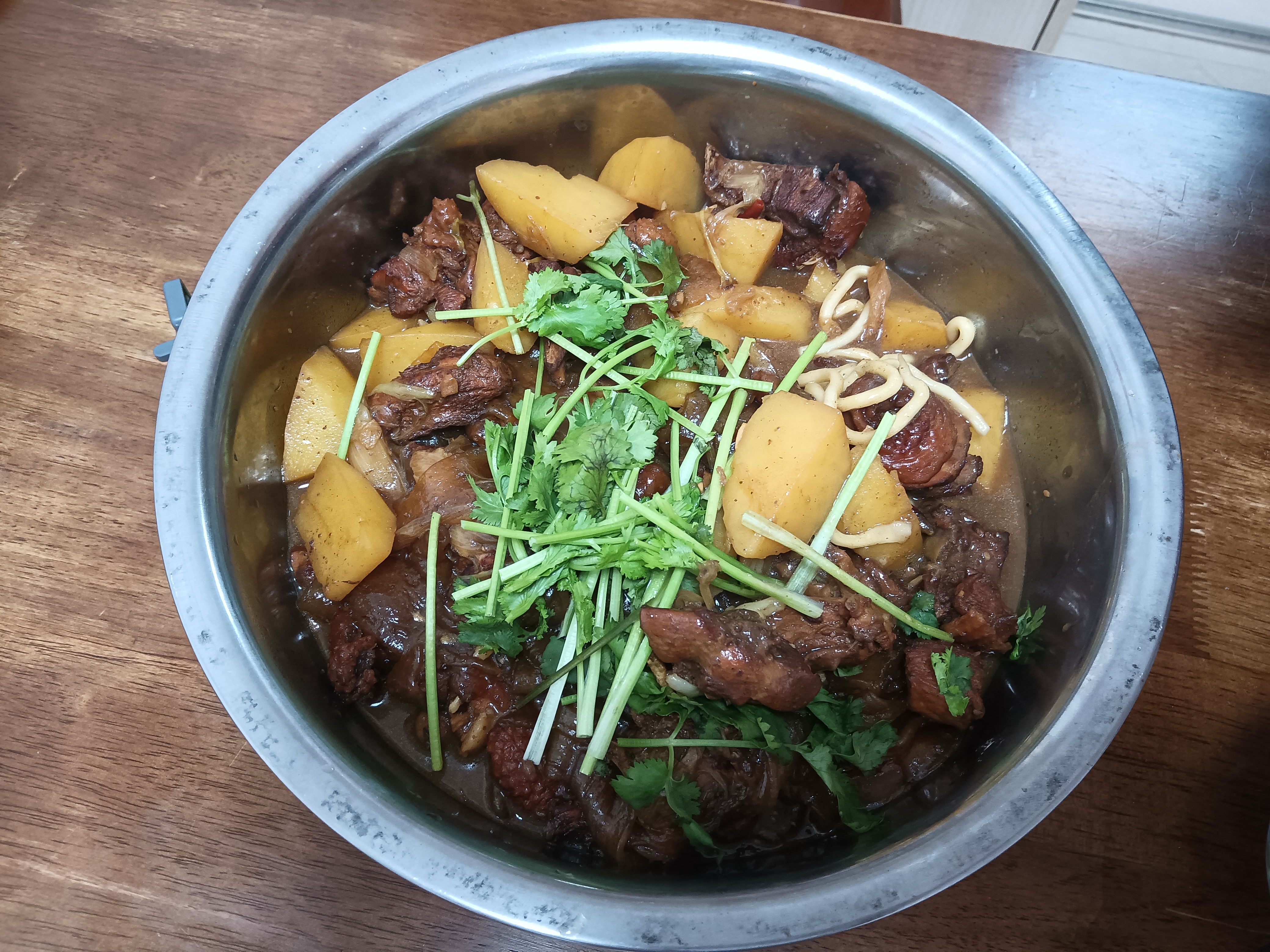 Meat Stew | ["meat","potatoes","cilantro","ginger","noodles"] | ["meat:300g","potatoes:200g","herbs:50g"] | |